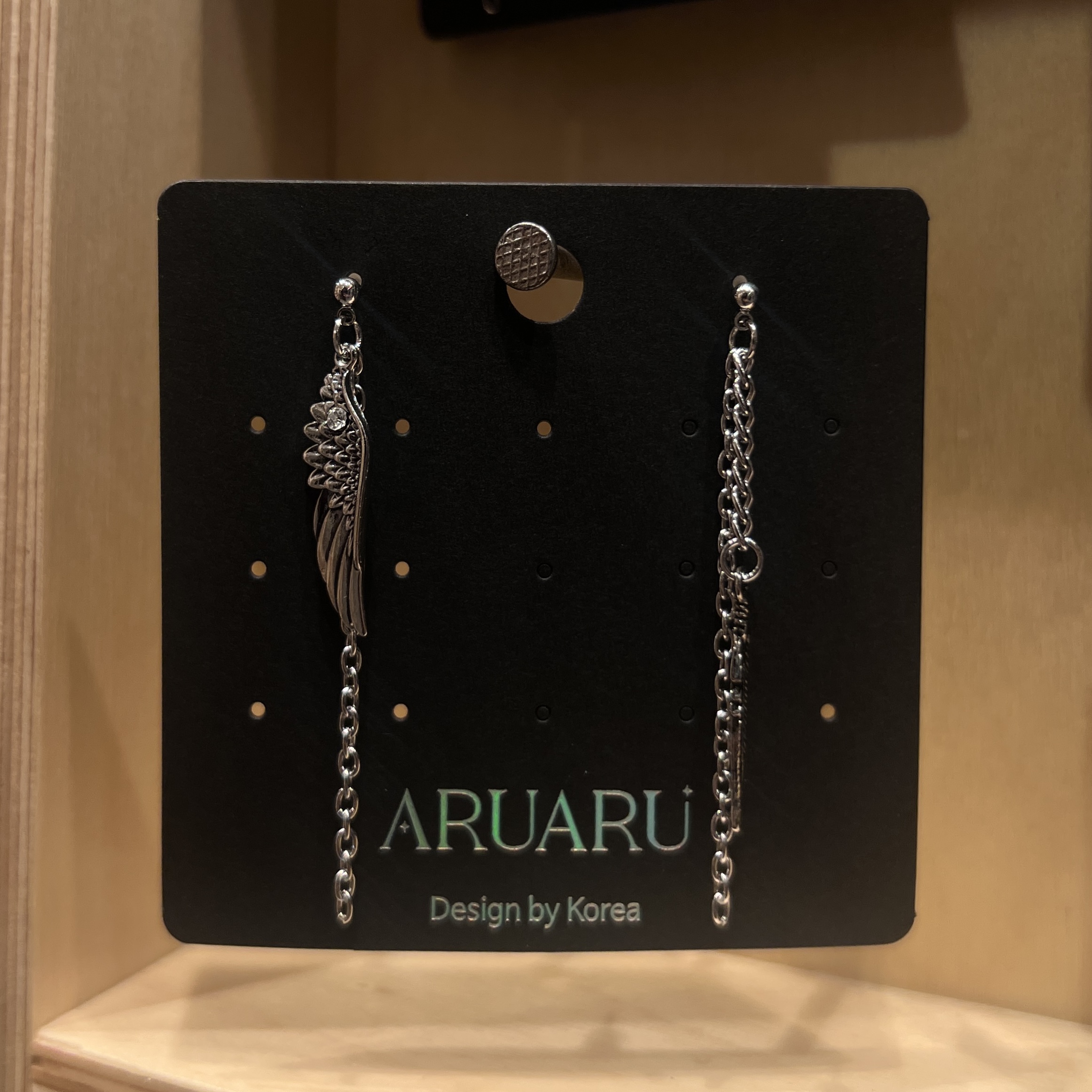 片耳には繊細に造形された羽のモチーフ、もう片耳にはシンプルなチェーンをあしらった左右で異なるデザインを楽しめるアシンメトリーピアス💖