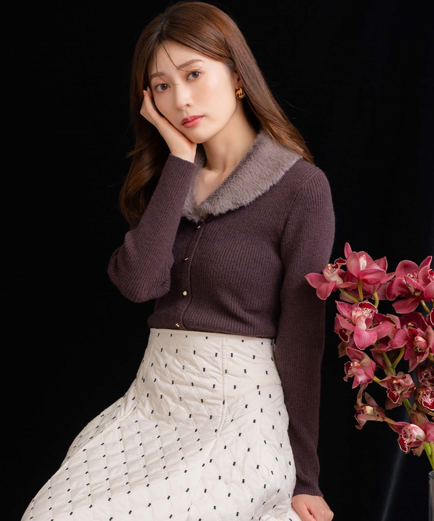 フェイクファーの襟が華やかなアクセントを添えるニットトップス。