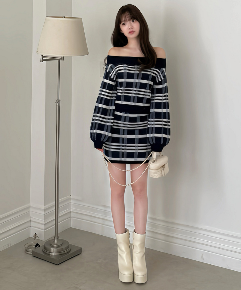 デコルテを美しく魅せるオフショルデザインやスカートのタイトシルエットが女性らしさを演出してくれます。