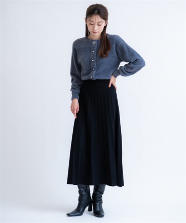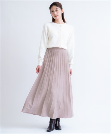 フェザートップスとプリーツ編みのニットスカートをドッキングしたワンピース。