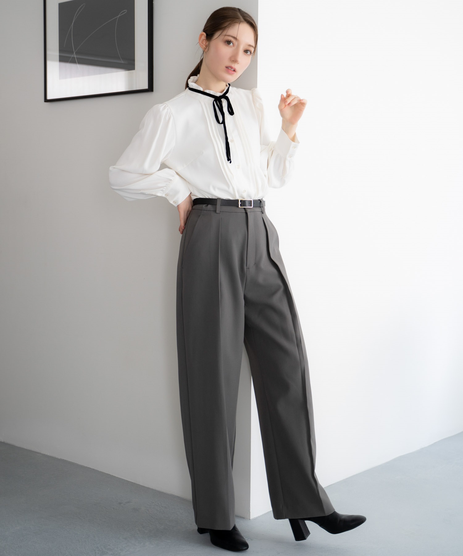配色の合皮ベルトがアクセントのストレートパンツ。