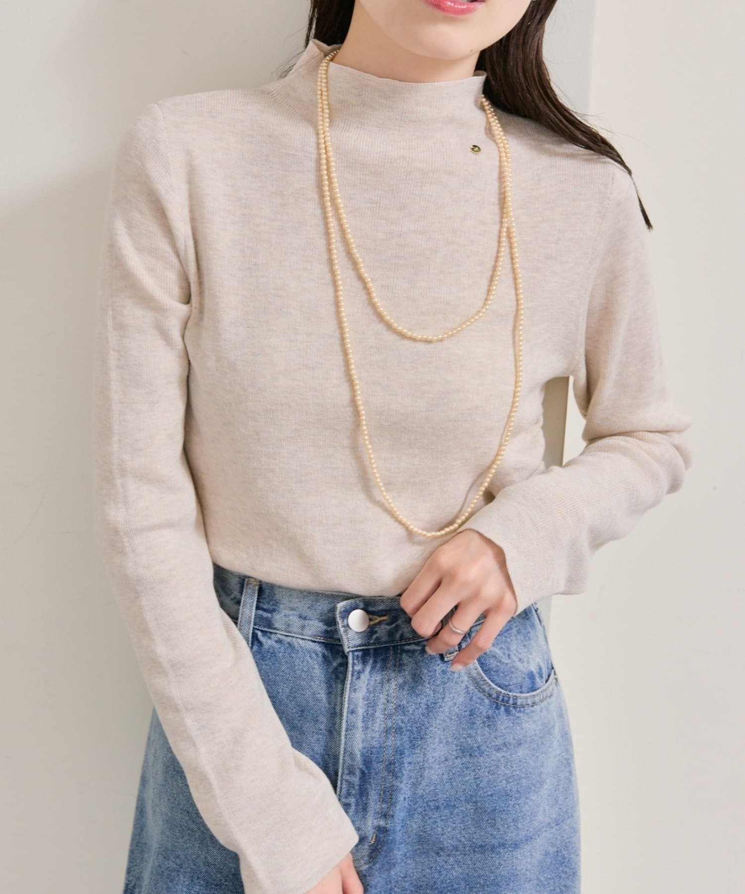 レイヤードスタイルに最適!上品見えするプレートがポイントのハイネックニット