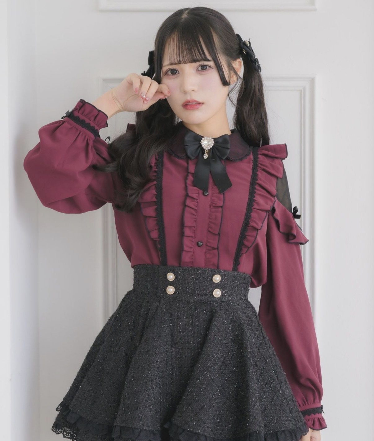 ラッフルとレディライクなディテールで甘さをプラス♡ メロー配色との相乗効果で縦ラインをすっきり見せ、旬な女の子らしいシルエットに。カラバリ豊富な4色展開でお気に入りの一枚が見つかるブラウス♪ ボタンもハート型でとことん可愛さをON。
