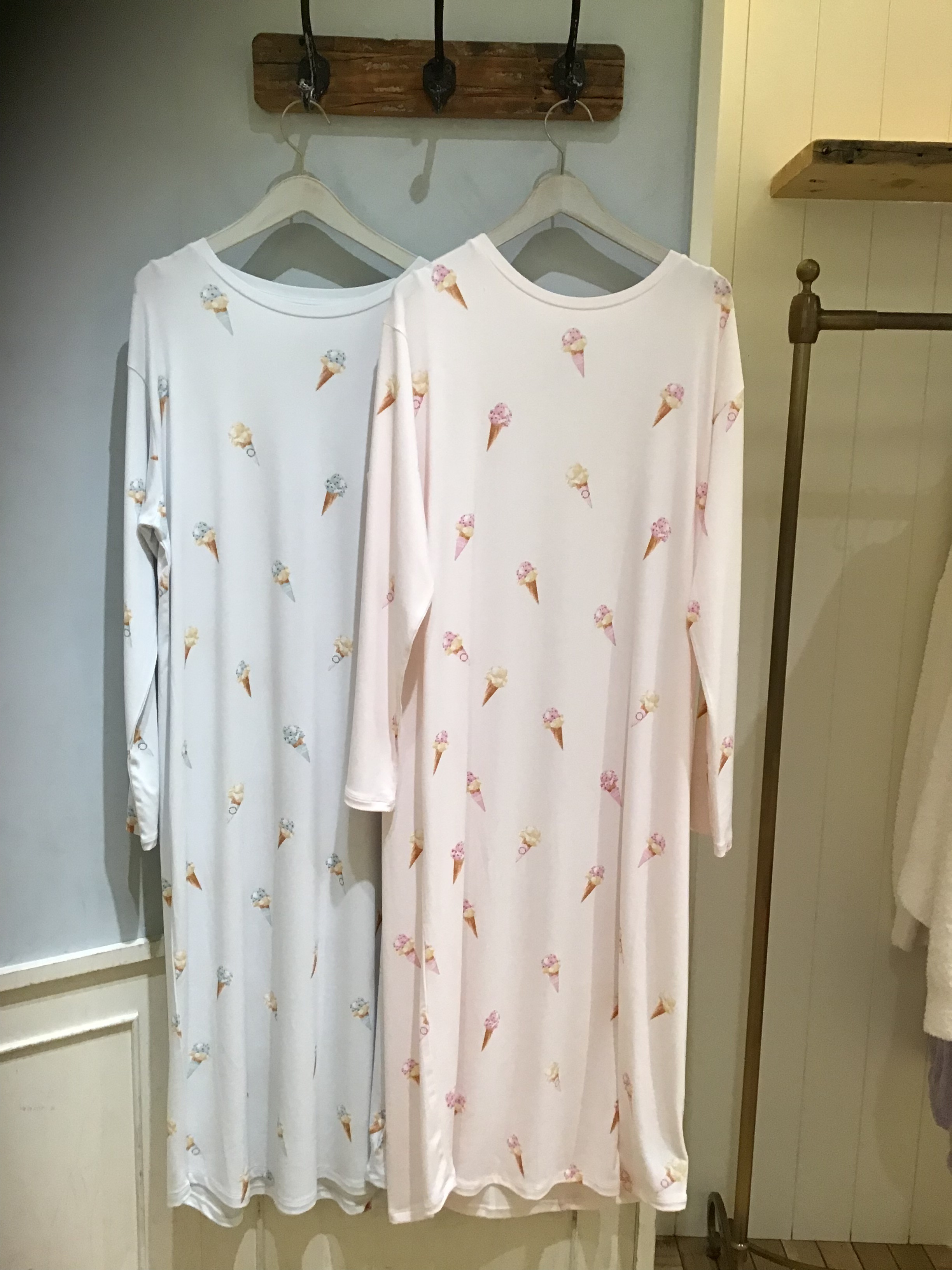 寒さが続くこの時期にうれしい、やや厚みのある柔らかいレーヨンを使用したワンピース🍦✨全体に散りばめたコーンアイス柄は、スリーブの有無やフレーバーの違いなど、よく見ると色々なアイスが描かれているのがこだわりポイントです。1枚でさらっと着たり、羽織りをコーディネートしてもお楽しみいただけるゆったりとしたシルエットで仕上げました🎶