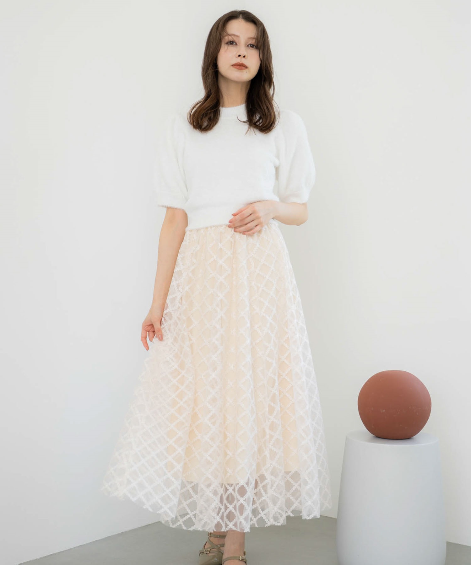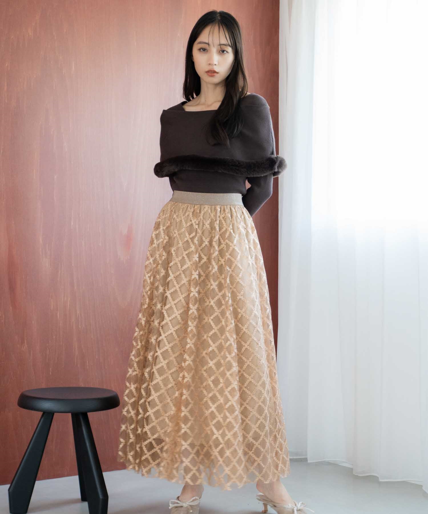 スタッズ入りの生地にチェックのレースチュールを重ねた、こだわりのディテールが光るスカート。