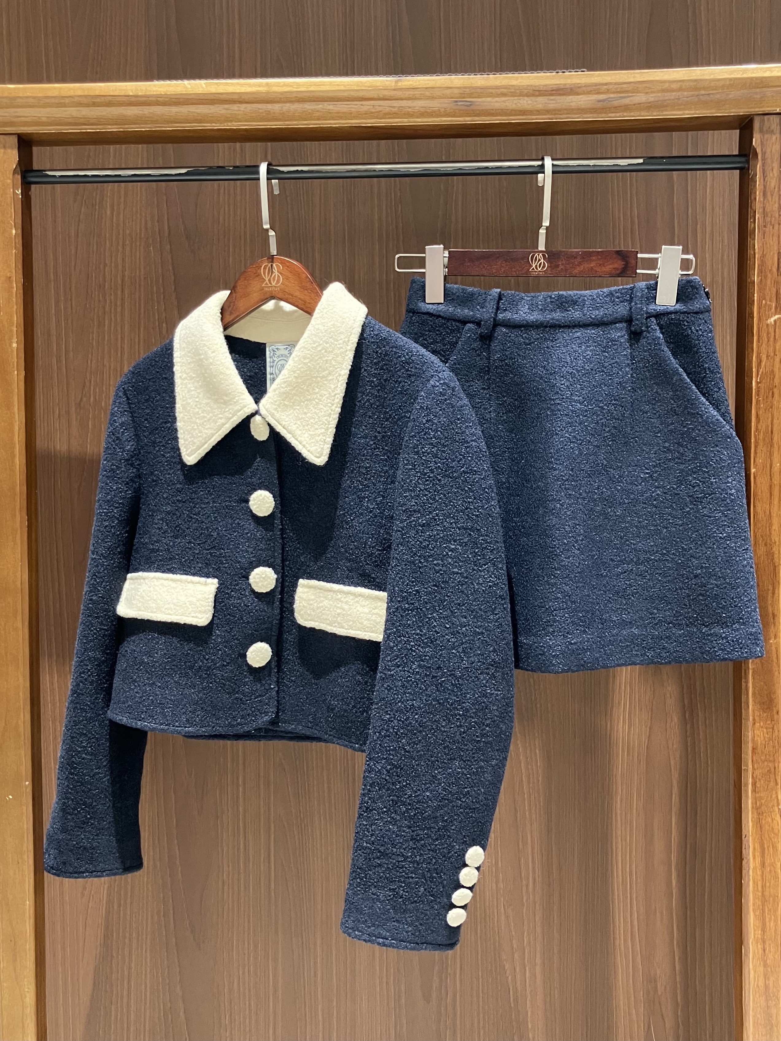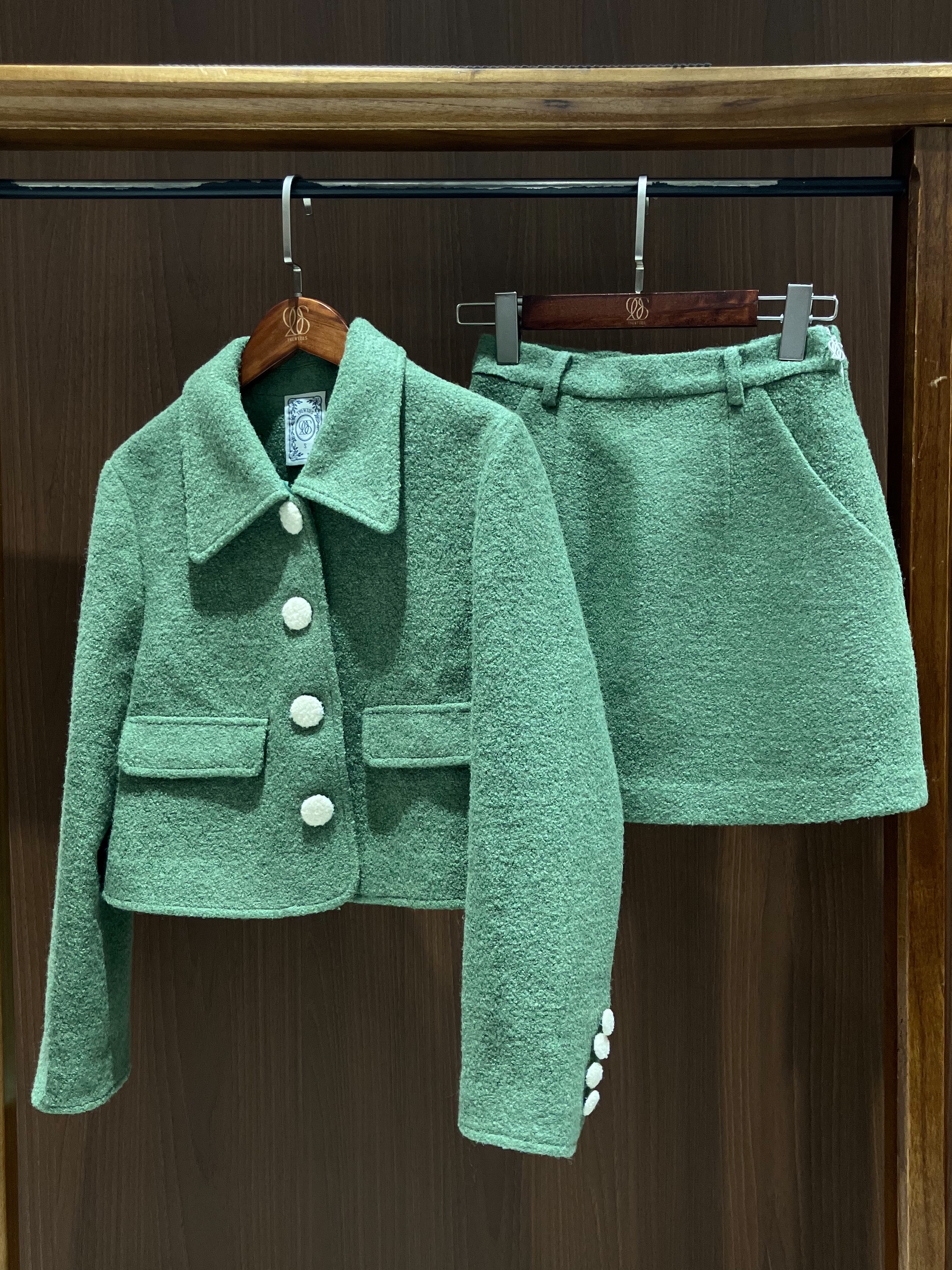 レトロなボタンがかわいい、ジャケットとミニスカートのセットアップです!