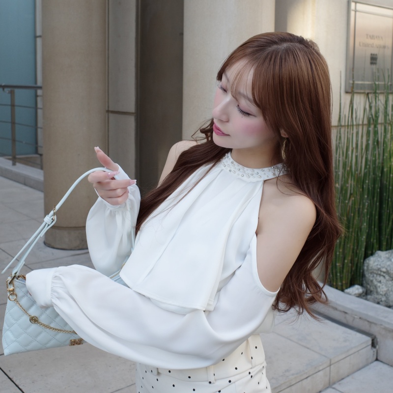 首元にパールとビジューをあしらい、フリルデザインで顔まわりを華やかに演出する大人可愛いブラウス✨