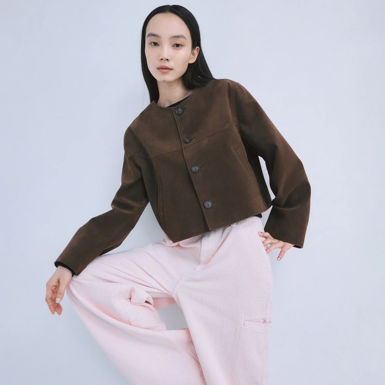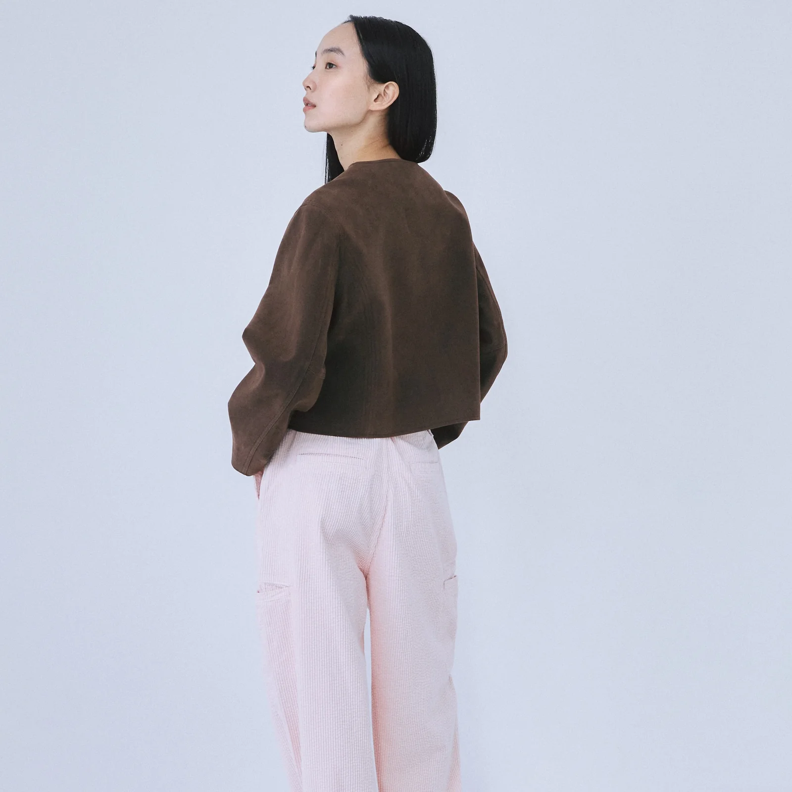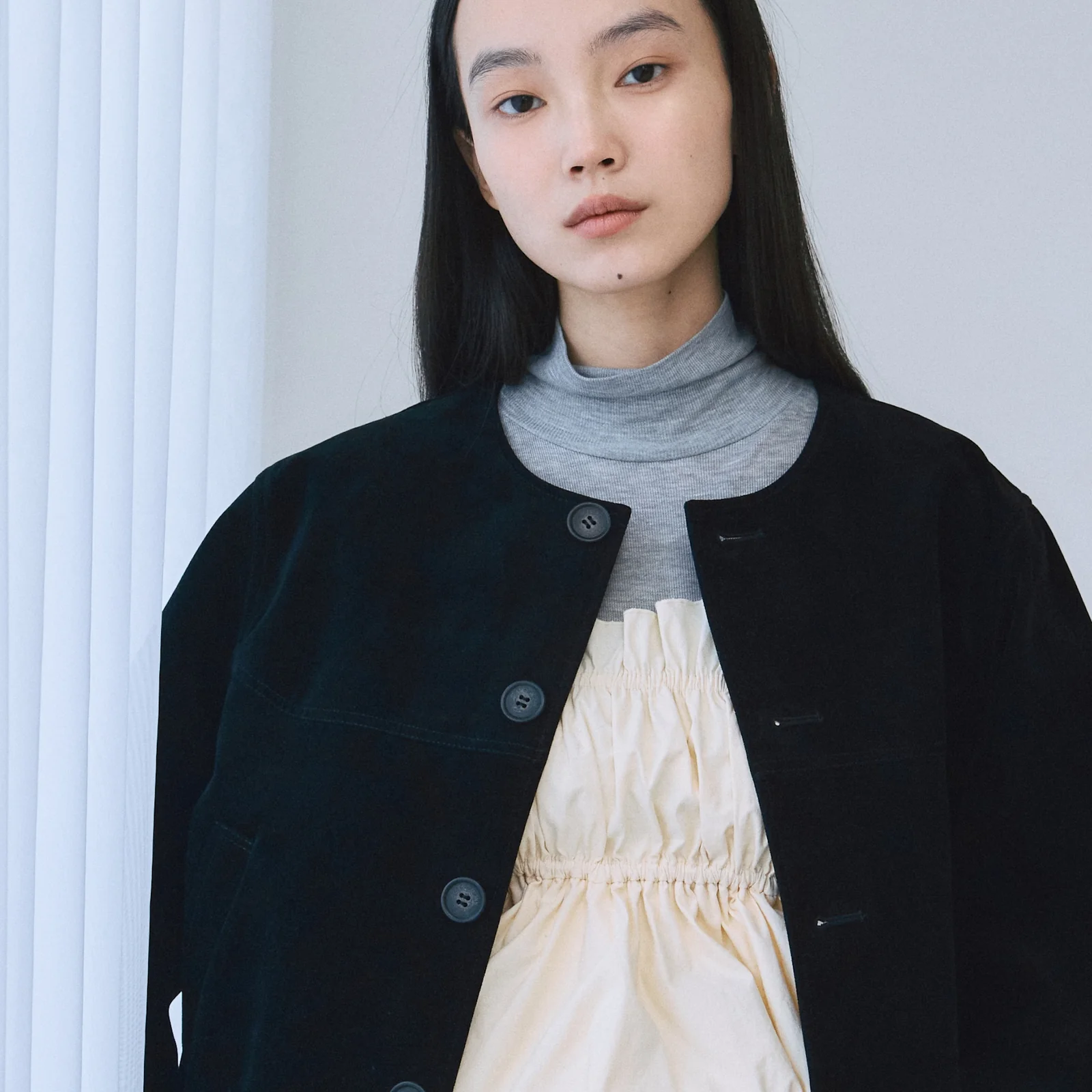フェイクスエードのマットな質感と、程良いハリで仕立てたノーカラージャケット。