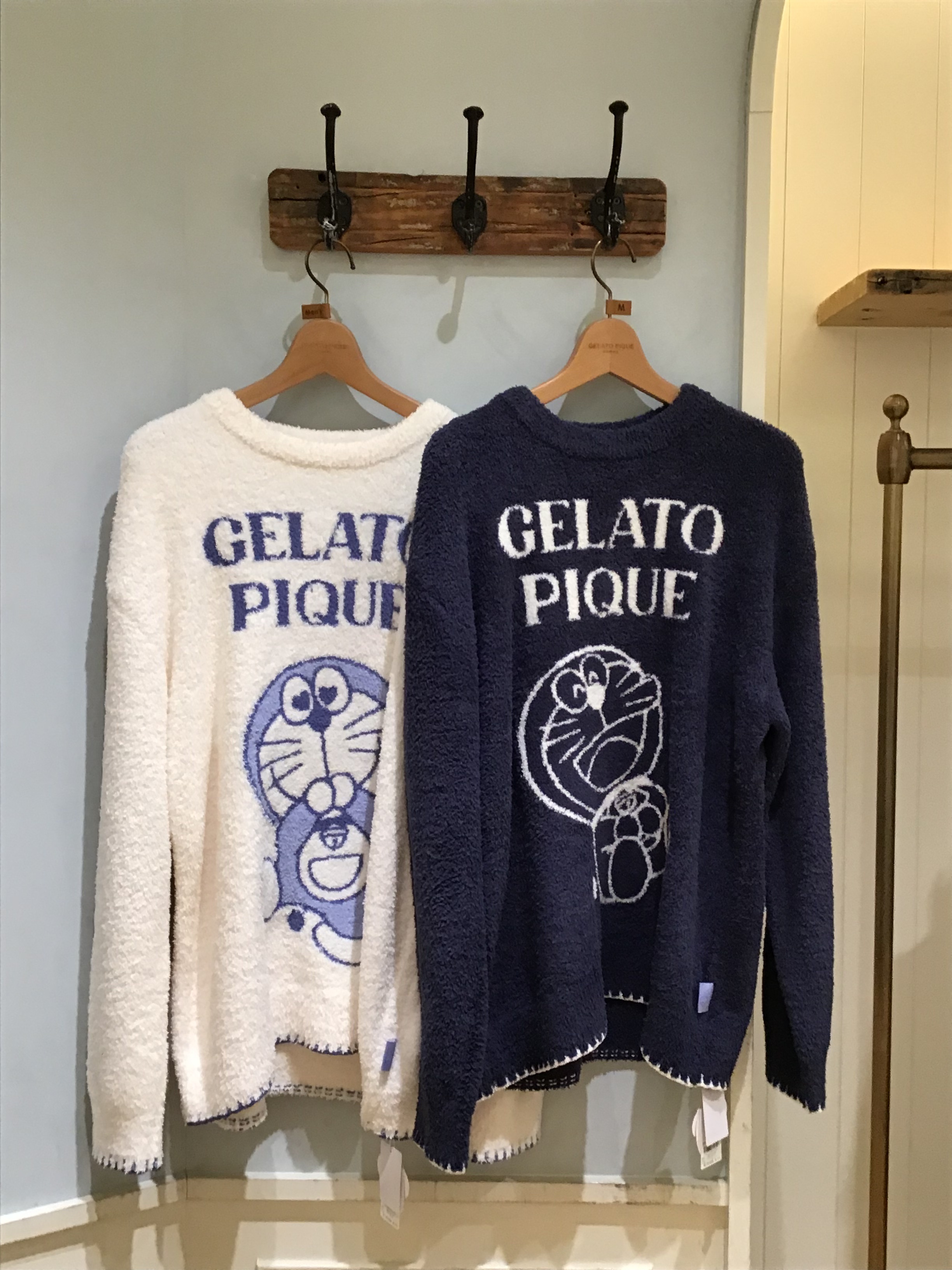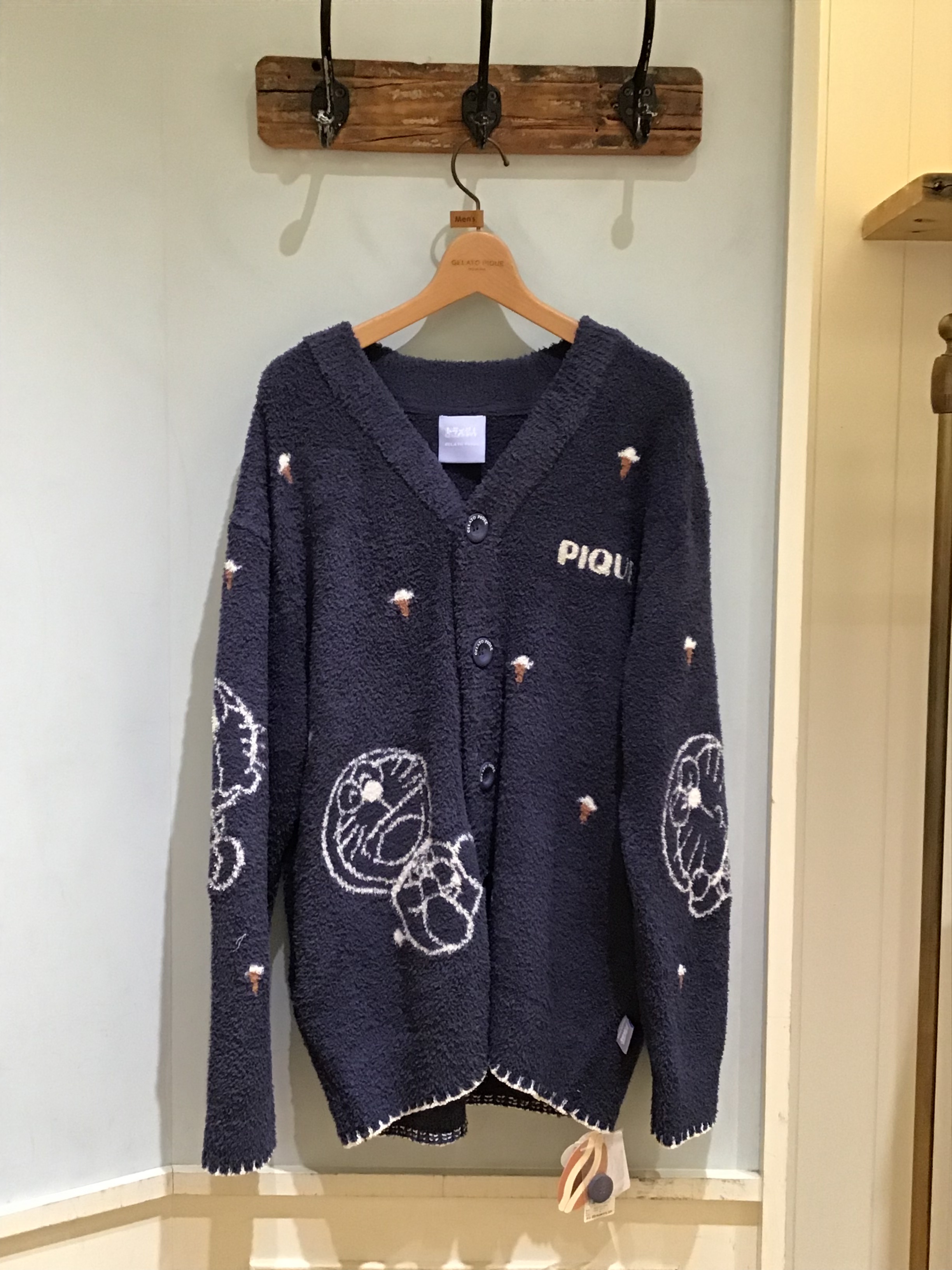 ボディや袖に、色々な表情のドラえもんをジャガードであしらった’ベビモコ’素材のカーディガンです。ベースはgelato piqueらしいアイスの柄🍦✨袖口や裾には温かみのあるブランケットステッチを入れ、胸元にはサガラ刺繍も添えました。ロゴ入りのオリジナルボタンやピスネームを使用したスペシャルな1枚です💙色はメンズの限定カラーとなるネイビーをご用意!!