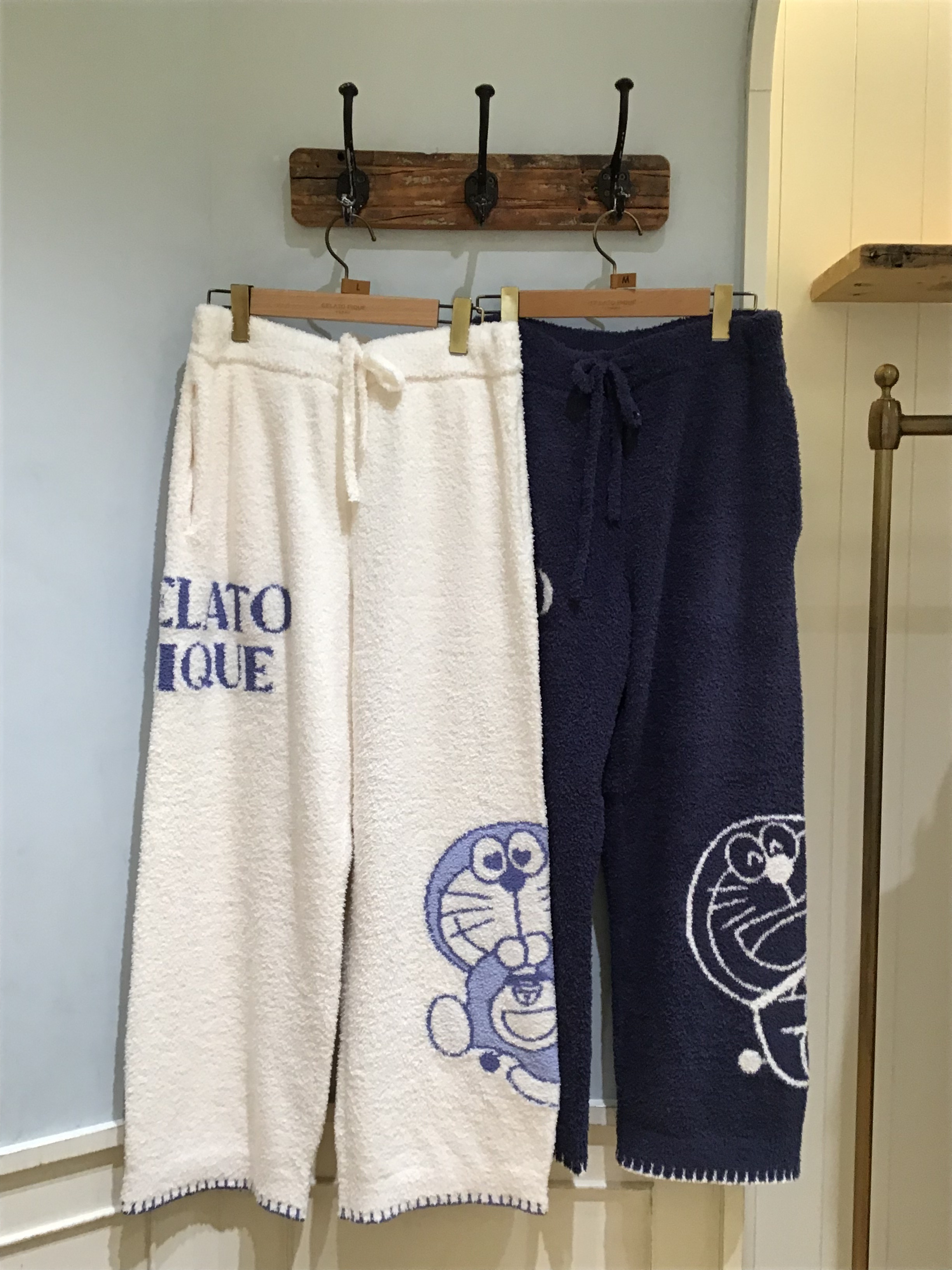 ’楽’の表情をしたドラえもんをジャガードで大きくデザインした、ふんわり優しい’ベビモコ’素材のメンズロングパンツです。右後ろにポケットをつけ、裾に入れた温かみのあるブランケットステッチや、オリジナルのピスネームもポイントです🎶色はブルーとメンズの限定カラーとなるネイビーをご用意💙