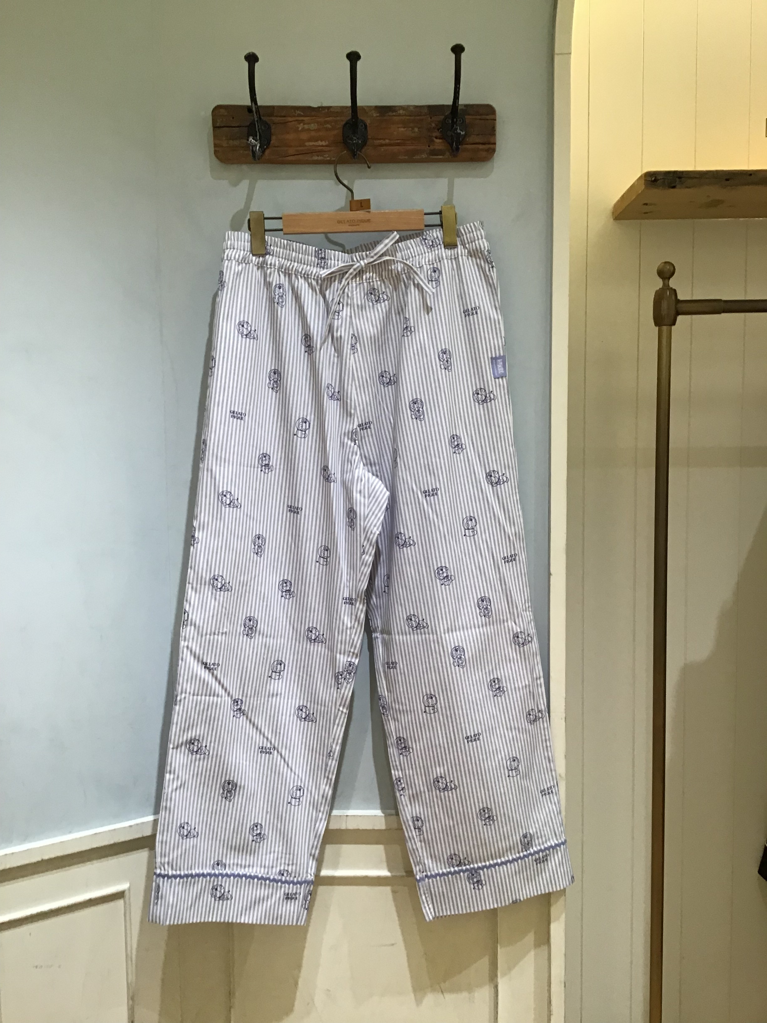 色々な表情のドラえもんを、gelato piqueらしい柄に落とし込んだ布帛ロングパンツです。ストライプ柄ベースで裾に波テープを付けたデザイン💙右後ろポケットのロゴ刺繍や、ウエストのステッチ仕様、色を効かせたピスネームもさりげないポイントです🎶