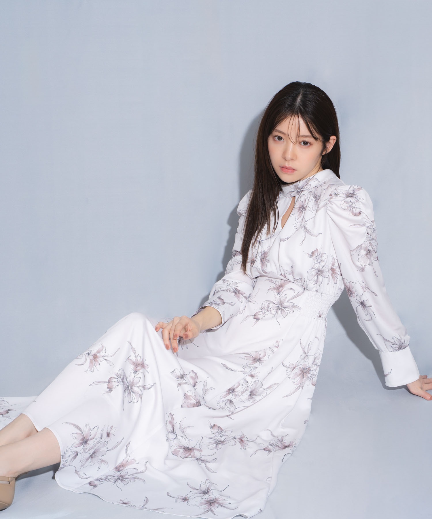 大柄ながら繊細なタッチのプリントが大人の華やかさを引き立て、高めのウエストから広がるシルエットでスタイルアップも叶えます。