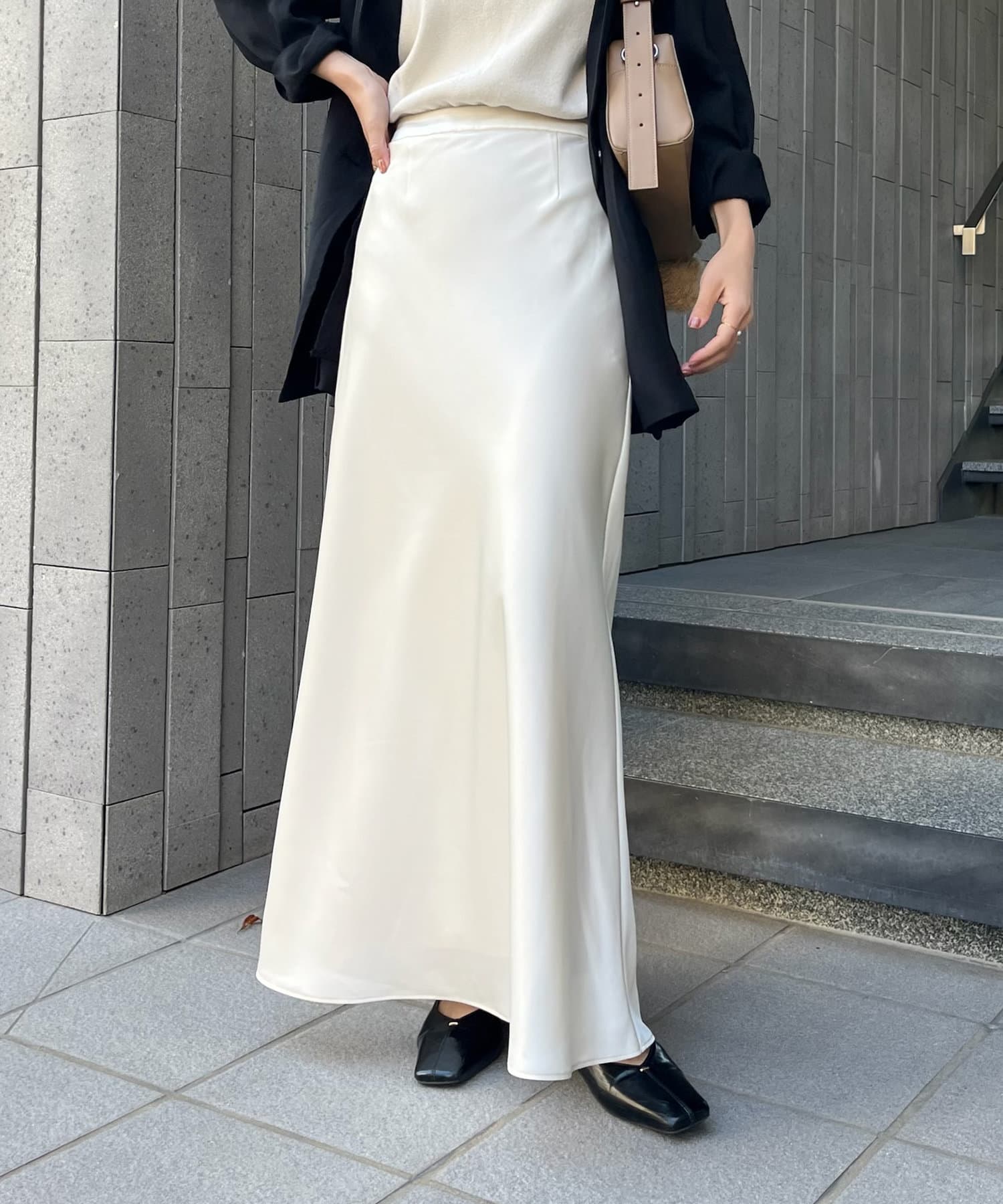 サテン素材が上品なアイテムでストンと落ちるAラインシルエットが綺麗✨