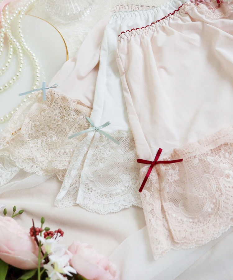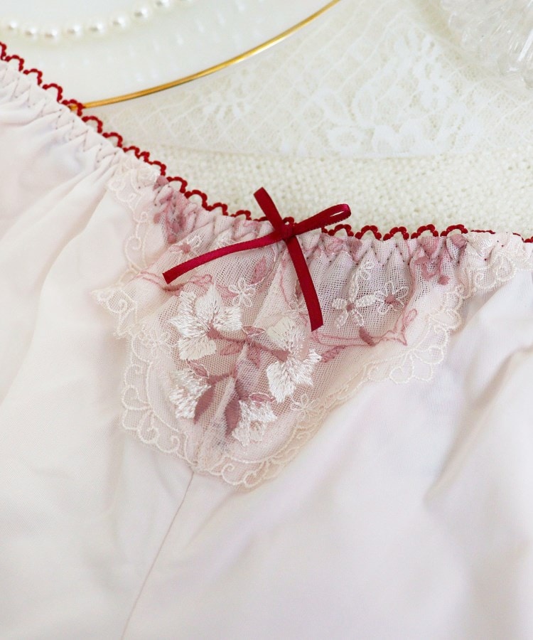 キラキラと輝く繊細な小花たちを散りばめた、リサマリのバレンタインシリーズです。レースにはさりげなくハートデザインを刺繍して、バレンタインのエッセンスを少し取り入れた、上品で清楚な印象に。普通糸とラメ糸、厚みのあるウーリー糸を使用することで、大人っぽくも豪華な柄行きに仕上がりました。フロントにはカッティングをほどこして、リボンにはタッセルをイメージした3連のハートチャームをあしらい、特別感を演出。脇からバックスタイルにかけてストレッチレースで切り替えて、細部まで心ときめくデザインをお楽しみいただけます。カラーはちょっぴり大人なスウィーツをイメージした、バレンタイン気分を盛り上げてくれるコレクションです。