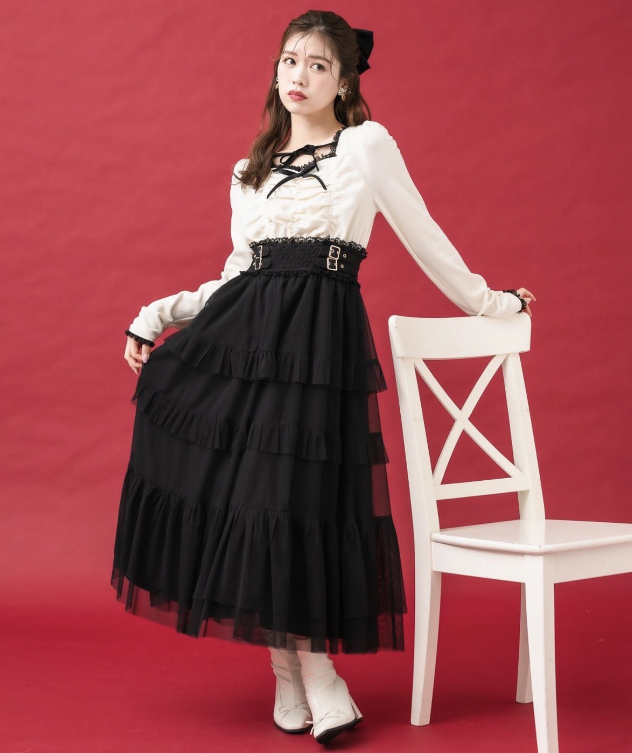 異素材のコントラストが目を惹くドッキングワンピース♡ウォーム感のあるトップスと、スカートは軽やかなチュールのティアードデザインで、季節感と華やかさを両立しました。デコルテの程よい開きには華奢なリボンディテールをあしらい、女性らしい抜け感をプラス。上下をコーディネートしたようなセパレート見えながら、1枚で着用できるのも嬉しいポイントです。