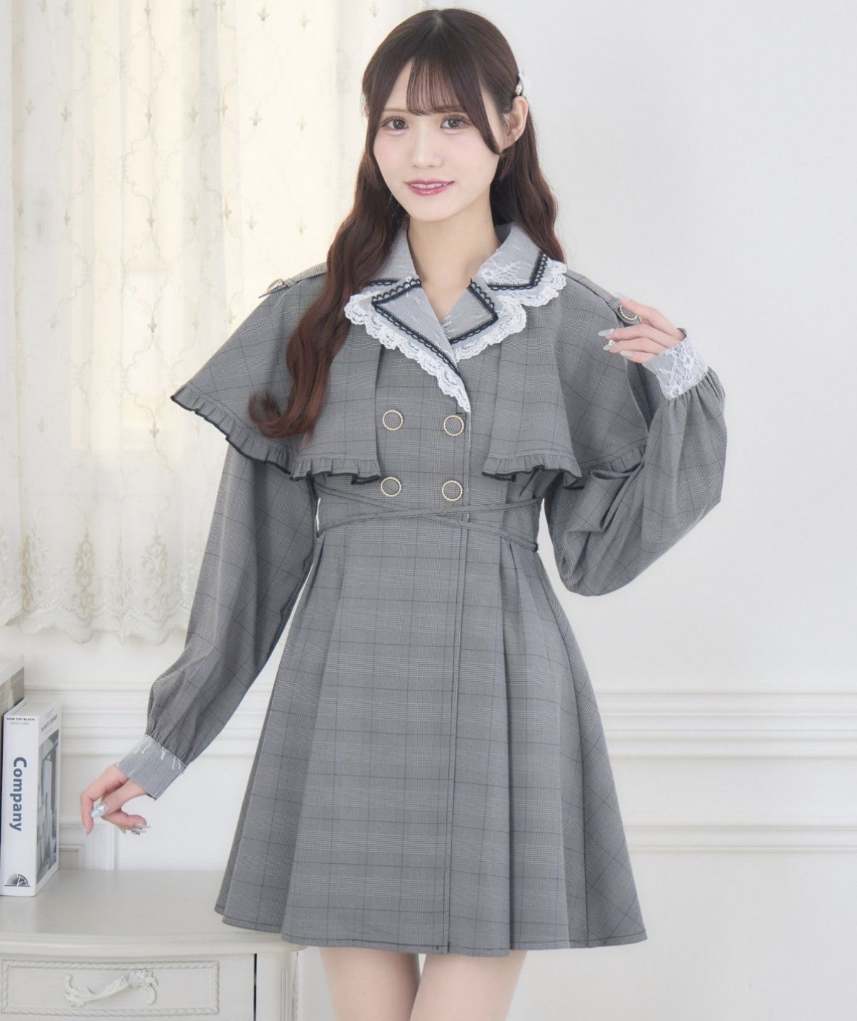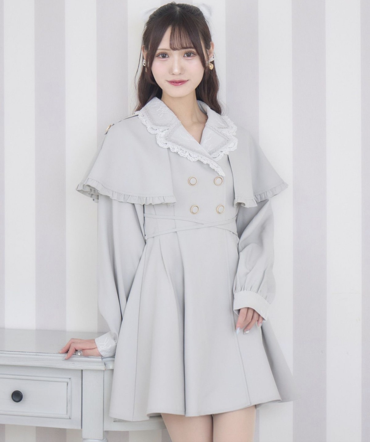 ケープデザイン風のショルダーラインがお育ち良さげな印象を与えるテーラードワンピース。ウエストクロスリボンでメリハリのあるシルエットに仕上げ、クラシカルな雰囲気ながらも上品で可愛らしいスタイルを演出します。フォーマルシーンからちょっとしたお出かけまで、幅広く活躍する一枚です。