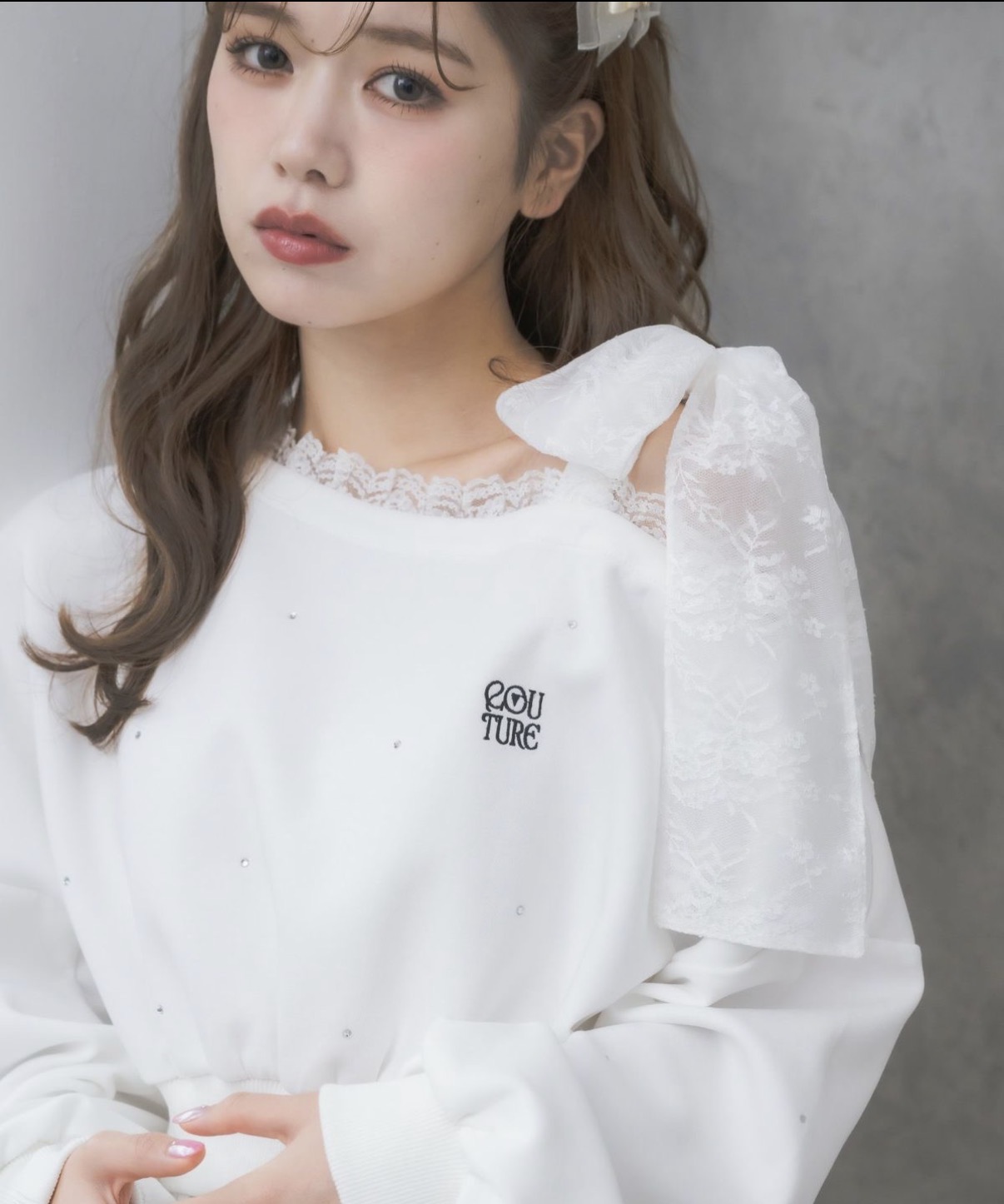 カジュアルだけどお洒落映えできるスウェットトップス。ランダムなストーンが全体的に施されていて光の具合でキラキラと表情をプラスします。ワンショルはインナーのストラップを隠しやすい幅感、レースリボンがお顔まわりの可愛いアクセントになってくれます。ボトムもスウェットアイテムと合わせるとセットアップ風に着用いただけます。