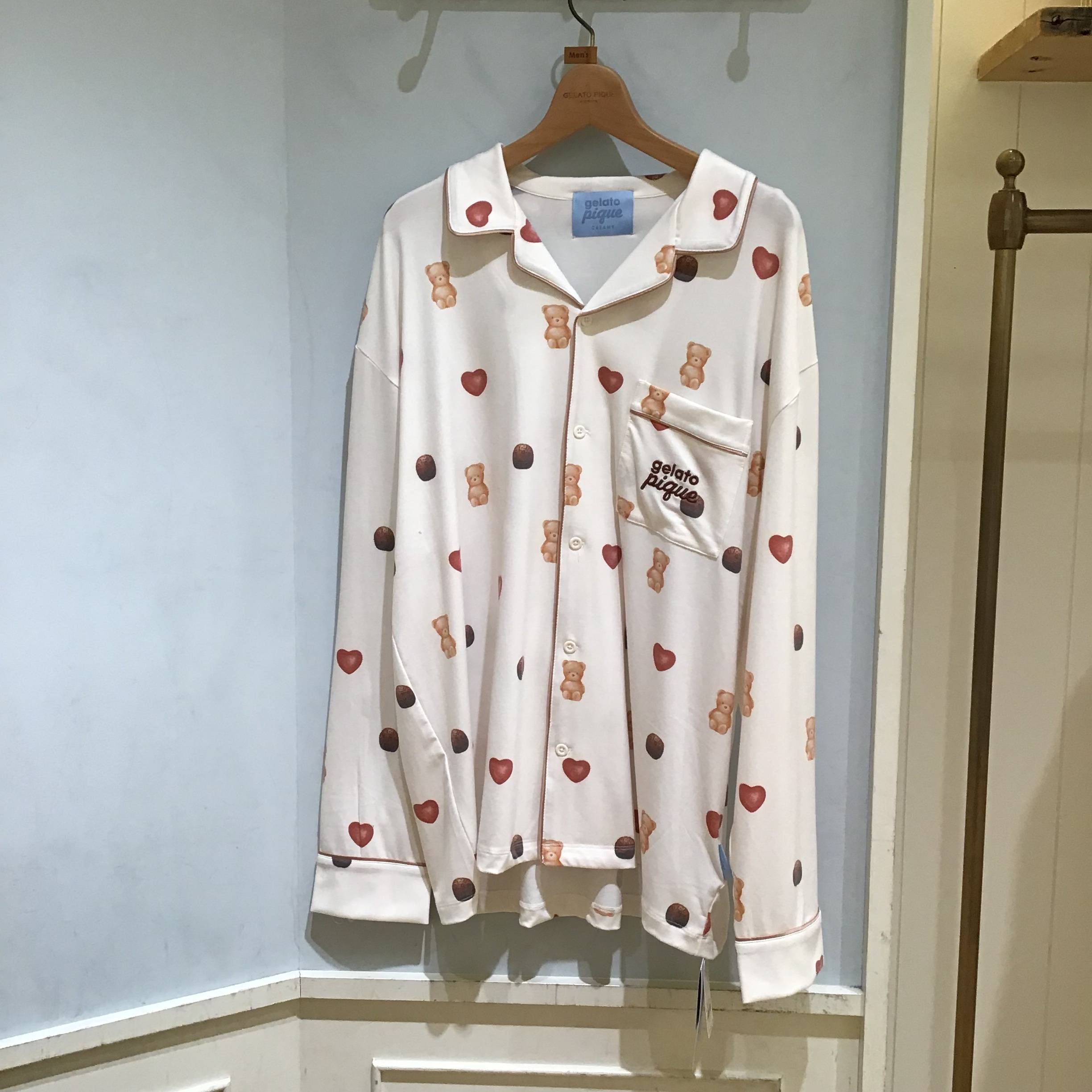ベアやハート形のアイス、チョコレート味のアイスをプリントしたバレンタインならではのHOMMEサイズ総柄シャツです。