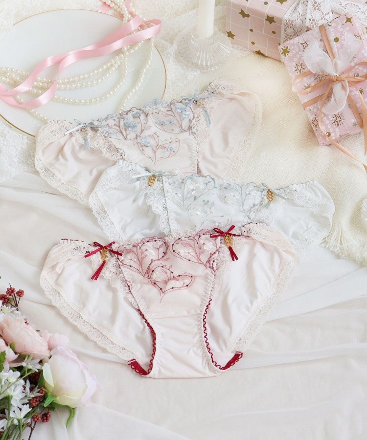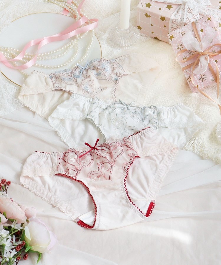 キラキラと輝く繊細な小花たちを散りばめた、リサマリのバレンタインシリーズです。フロントレースにはさりげなくハートデザインを刺繍して、バレンタインのエッセンスを少し取り入れた、上品で清楚な印象に。普通糸とラメ糸、厚みのあるウーリー糸を使用することで、大人っぽくも豪華な柄行きに仕上がりました。カラーはちょっぴり大人なスウィーツをイメージした、バレンタイン気分を盛り上げてくれるコレクションです。デザイン性は残しつつも、ラメ糸が肌に当たらないよう、仕様にもこだわりました。