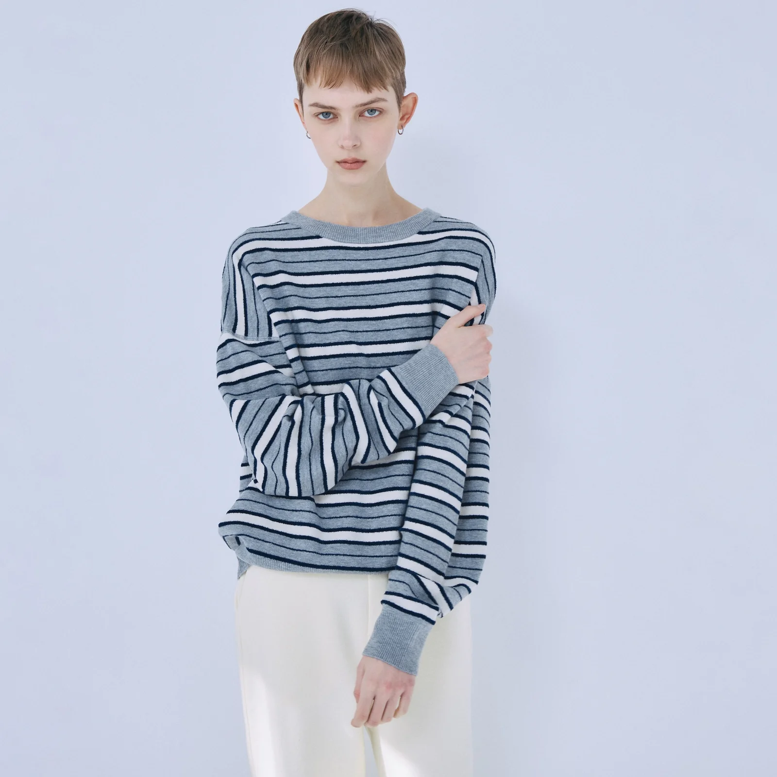 やや詰まった大人のクルーネックに、春らしい淡いトーンをミックスしたランダムボーダーがアクセント。