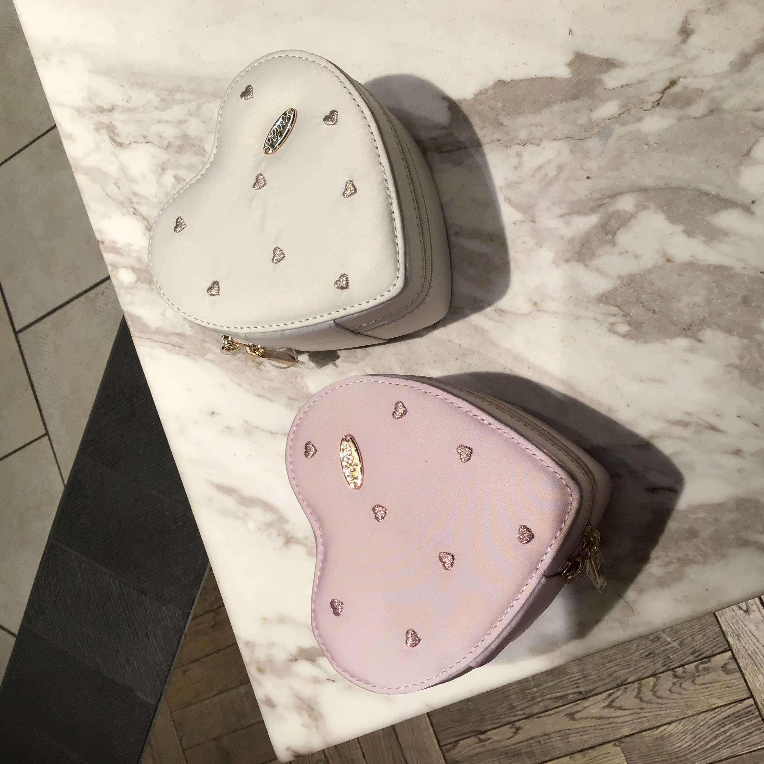 安定感のあるしっかりとしたハート型のフォルムに、さらにハート柄を入れたロマンティックなデザインがポイントのアクセサリーポーチと、ふんわりファーの存在感が可愛いヘアピンをご紹介いたします💞