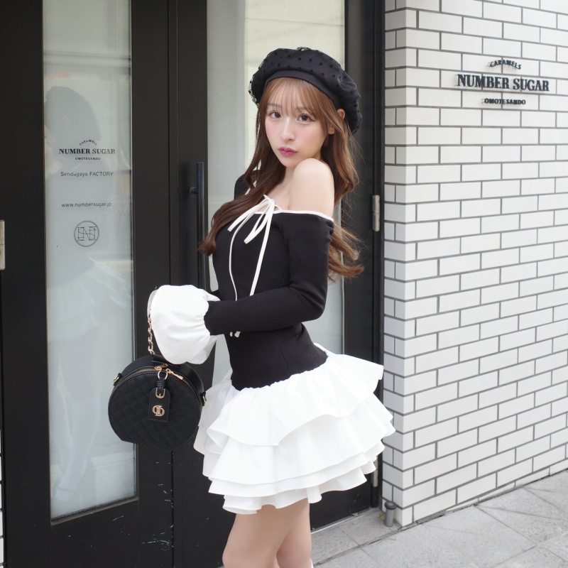 ワンショルの美カッティングでデコルテを綺麗に魅せつつ、リボンとフリルでガーリーさをひとさじ添えた洗練ワンピース🎀
