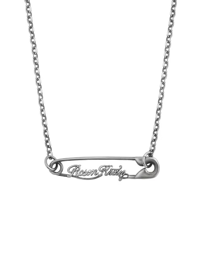 ブランド名が安全ピン部分に刻まれた、存在感のあるネックレスです。