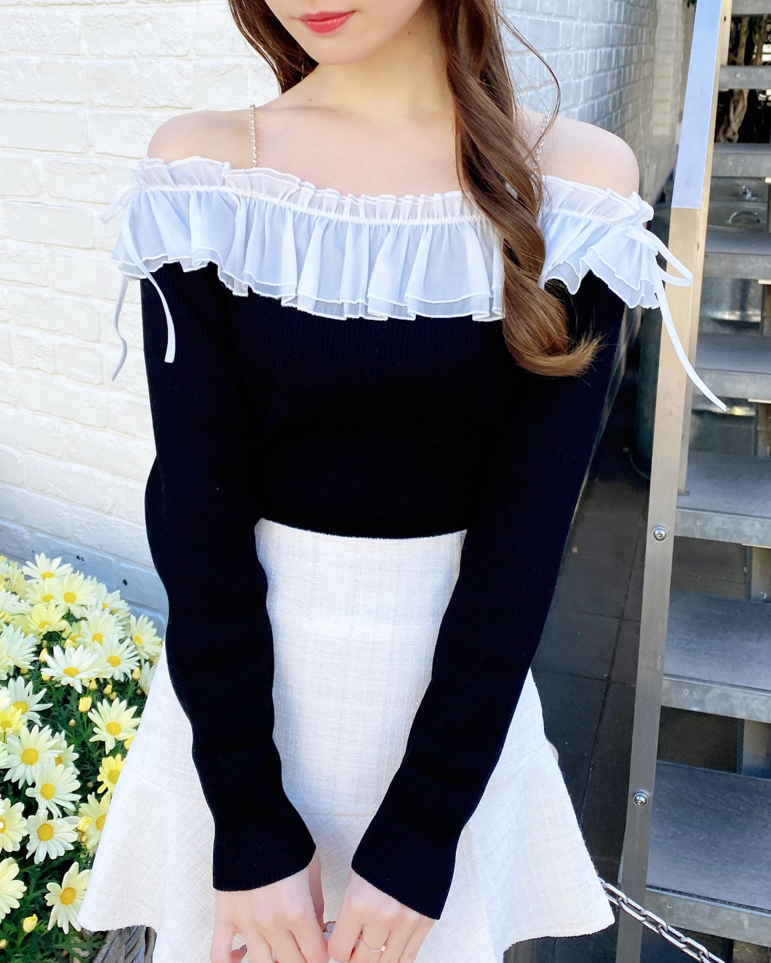⚫︎1261-900090 ラインストーンチェーンオフショルフリルニット