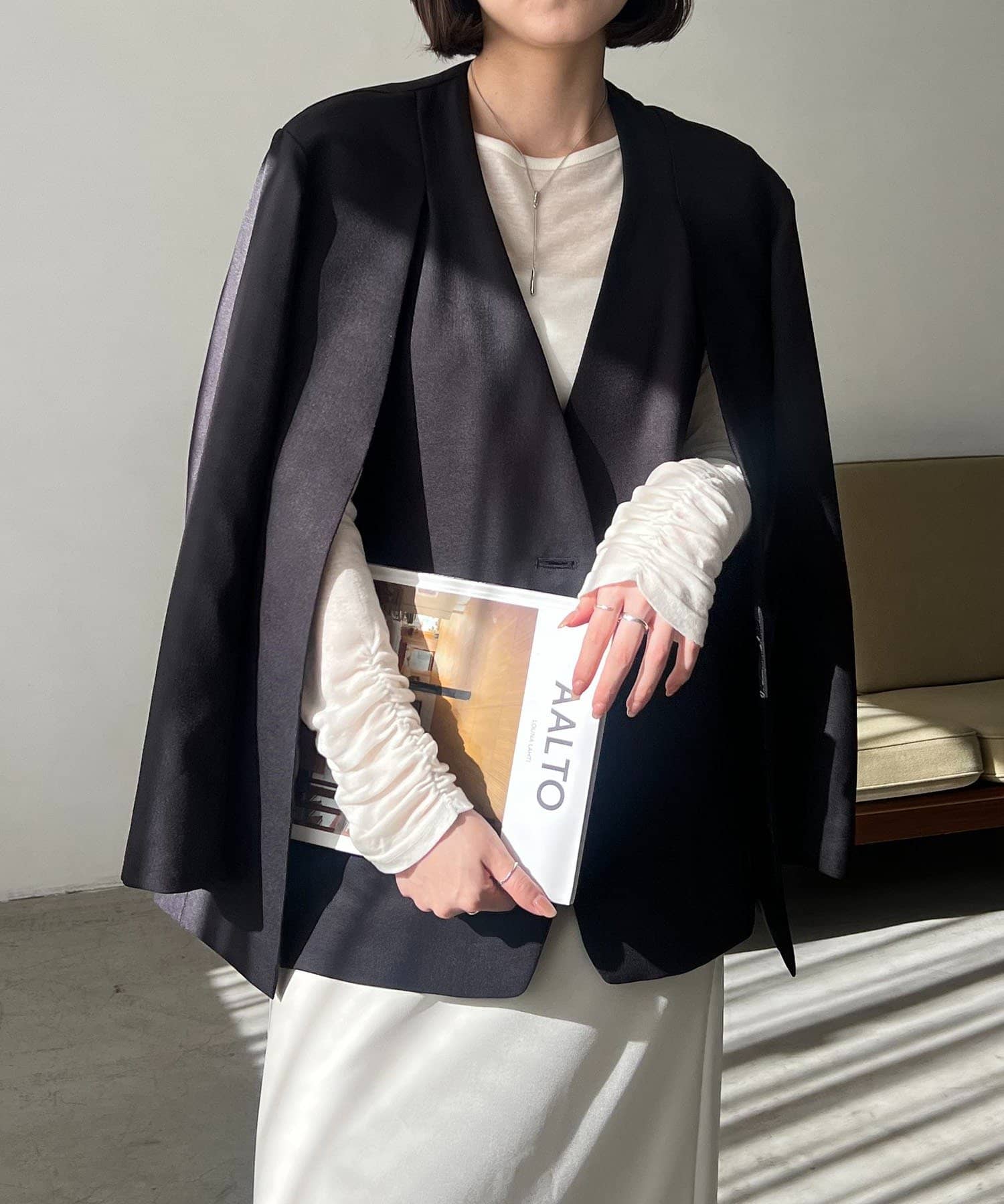 スリットに袖を通さずシンプルなジャケットスタイルでも着用できる2way仕様です◎