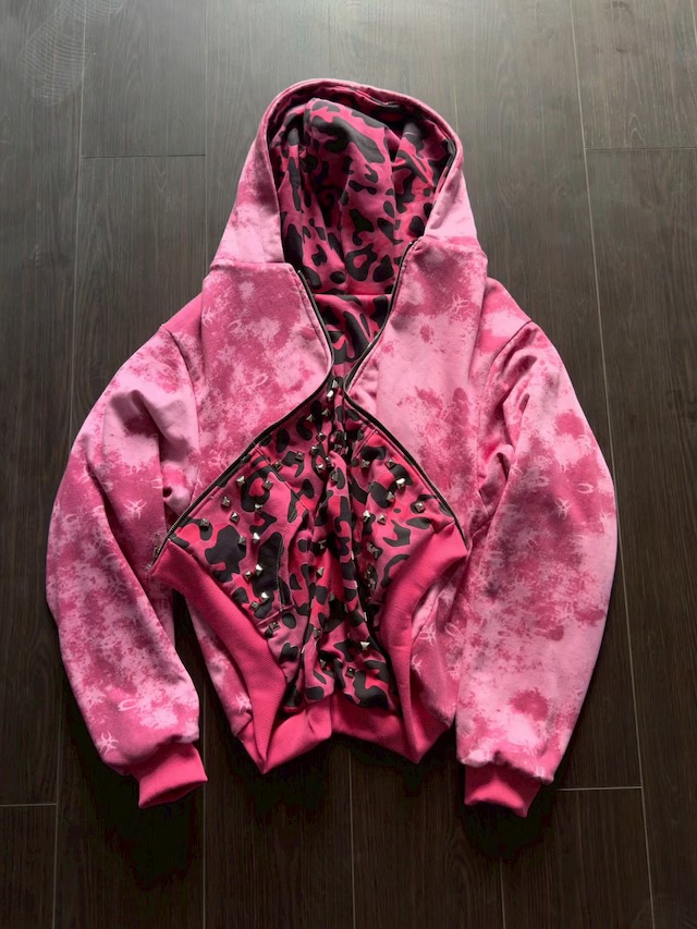 ピンクのヒョウ柄にスタッズが映える存在感のあるデザインとなっております。