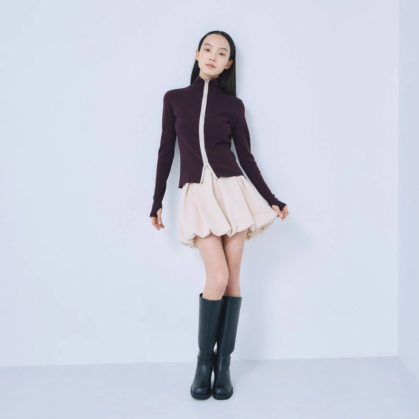 程良いハリとマットな質感が魅力のポンチ素材で仕立てたバルーンミニスカート。