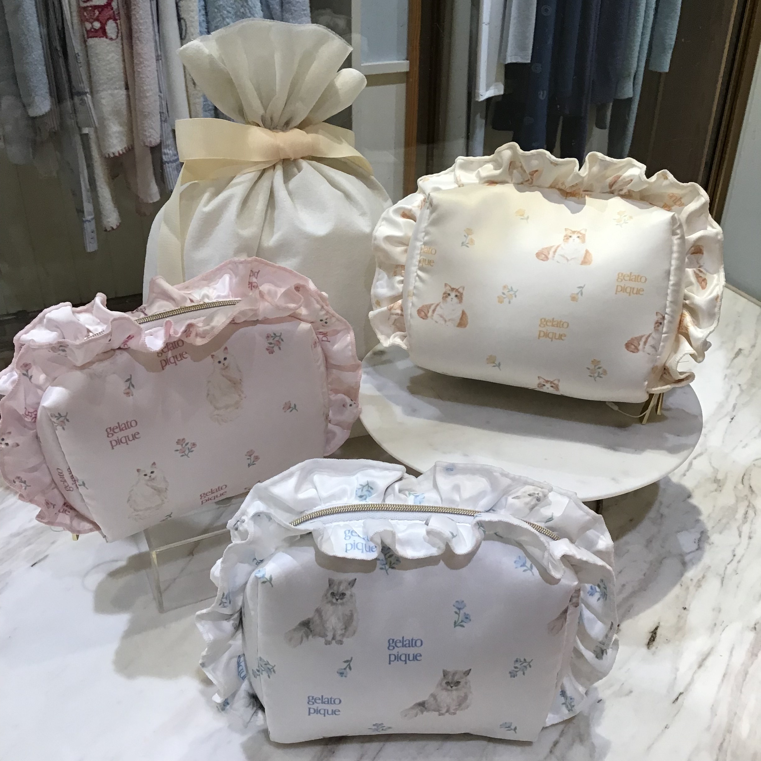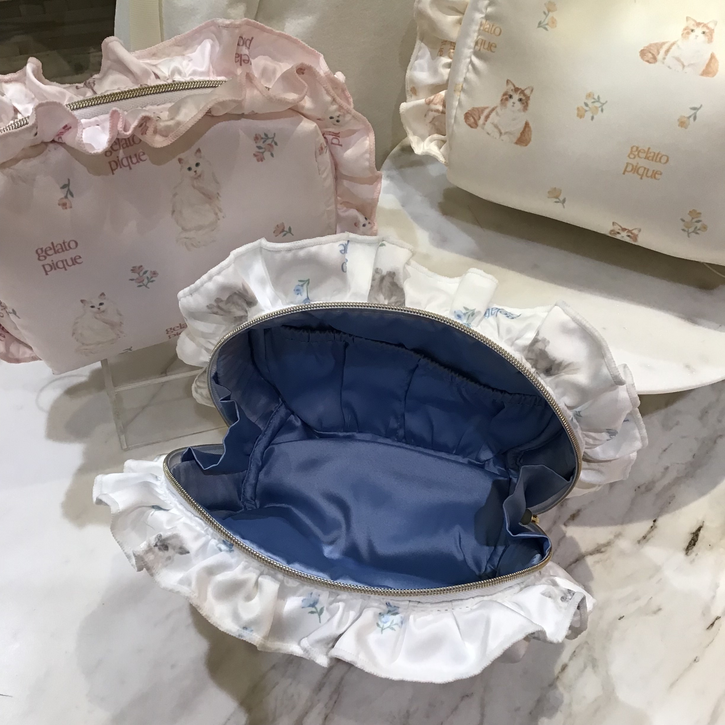 季節感のある小花柄と猫の絵柄を組み合わせた、総柄プリントのポーチ。品のある艶やかな素材感で、ダブルファスナーの周りにフリルをあしらい、デスク等に置いても可愛さを放ちます。