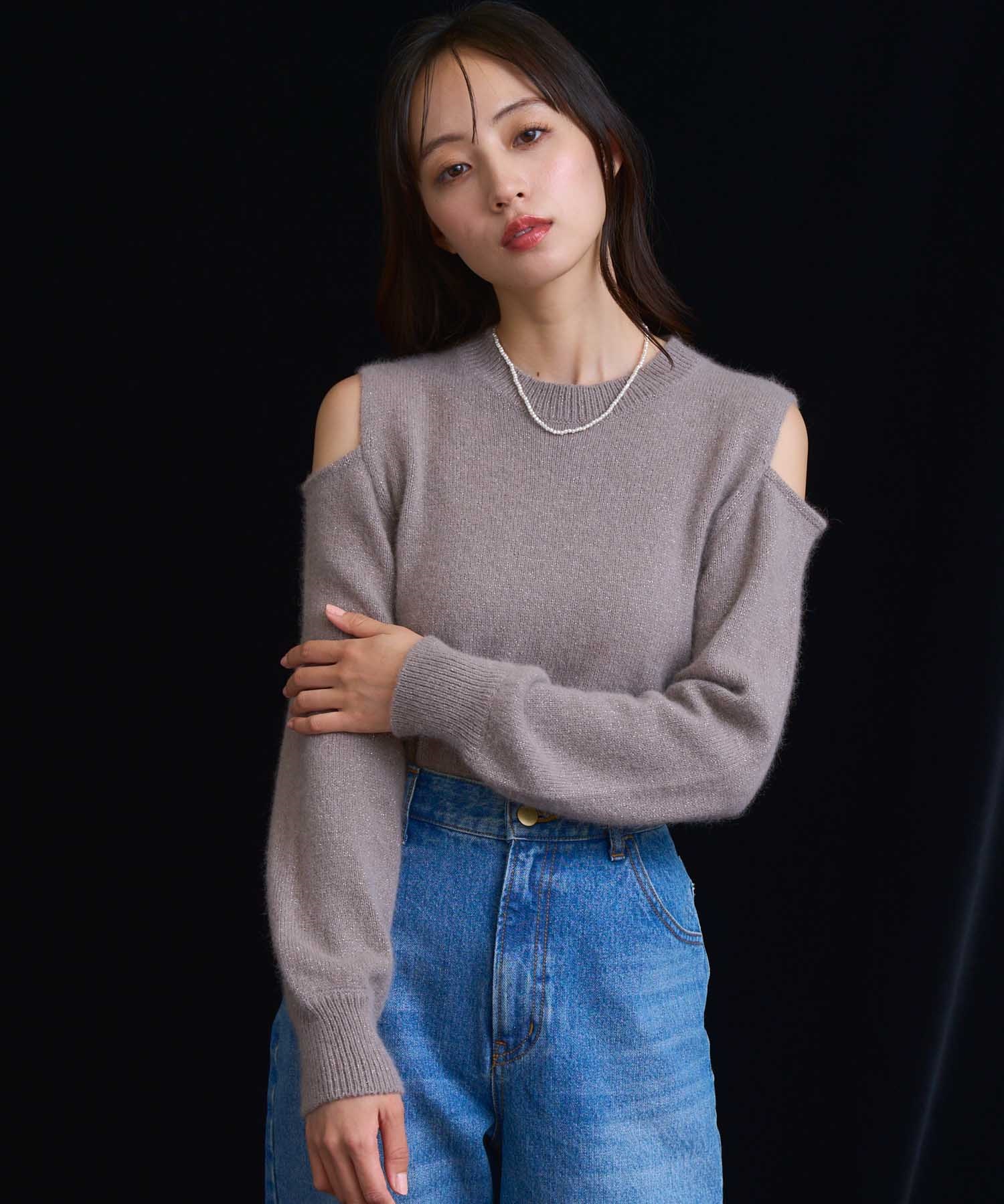 上質なフォックス混素材を使用した、肩開きデザインのニットトップス。 さりげない肌見せと、ふんわりとした柔らかな風合いが女性らしさを引き立てます。 落ち着いたカラー展開で、さまざまなコーディネートに馴染みやすいのも魅力のひとつ。 一枚で着映えする、主役級のアイテムです。