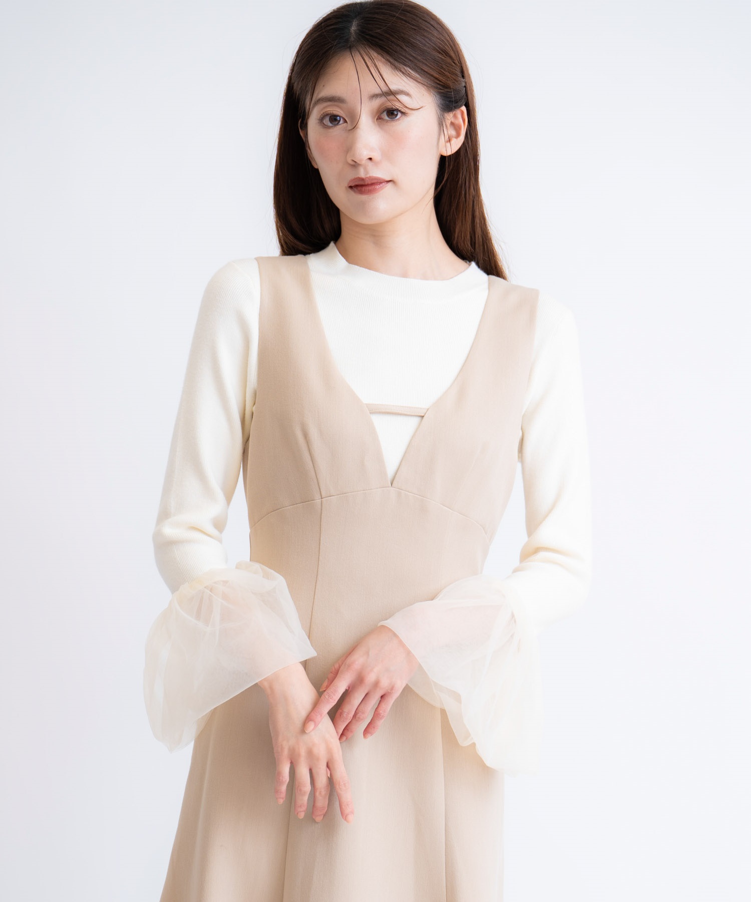 袖口にあしらったチュールが、さりげない華やかさを演出するニットトップス。