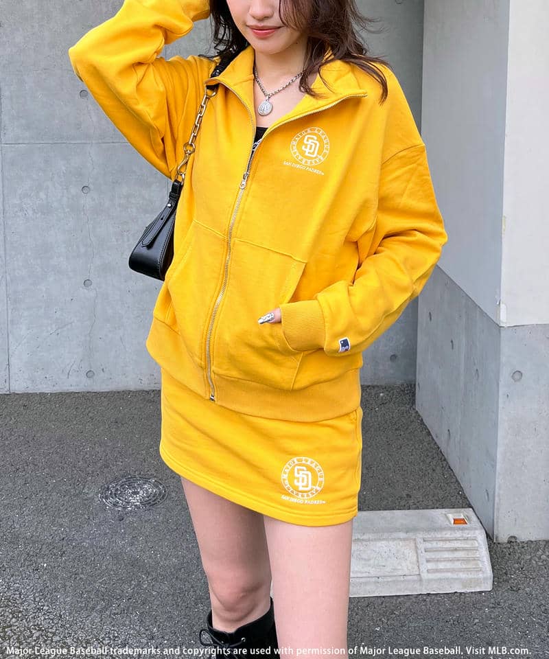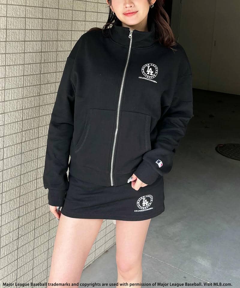 上下共通のエンブレムモチーフのロゴプリントと、袖口のバッターマンロゴがアクセントになり、さりげなくMLBらしさをアピール。