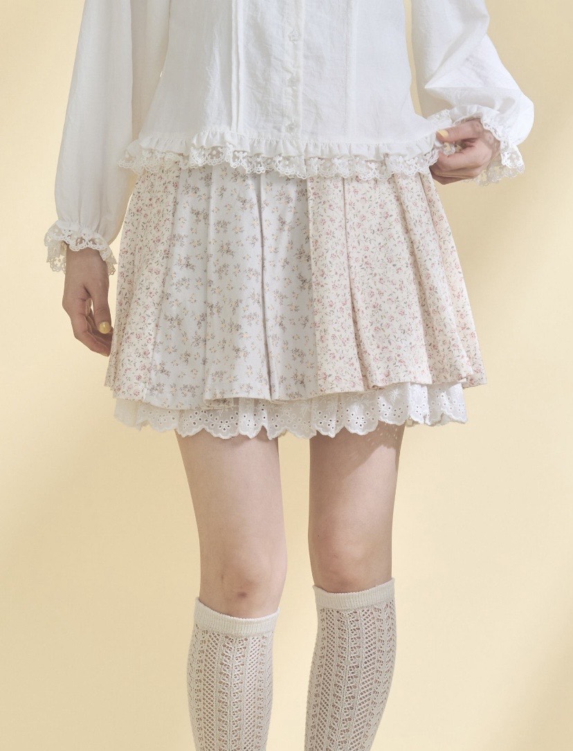 柄違いの小花柄を組み合わせた、淡いトーンのプリーツミニスカート。