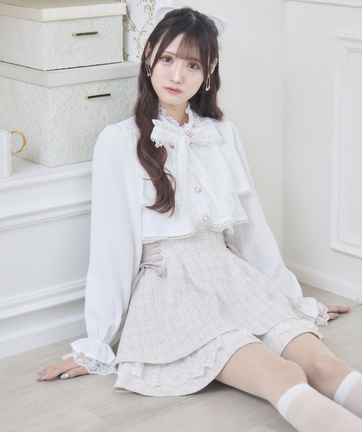 ふんわりとした2段ティアードが可愛らしいブラウス♡ヘムラインにはピコレースをあしらい、繊細で上品な印象に。細身でスッキリとしたボウタイリボンにはレースを重ね、華やかさをプラス。鎖骨の中心は控えめなVカットで、抜け感のある女性らしい雰囲気を演出します。