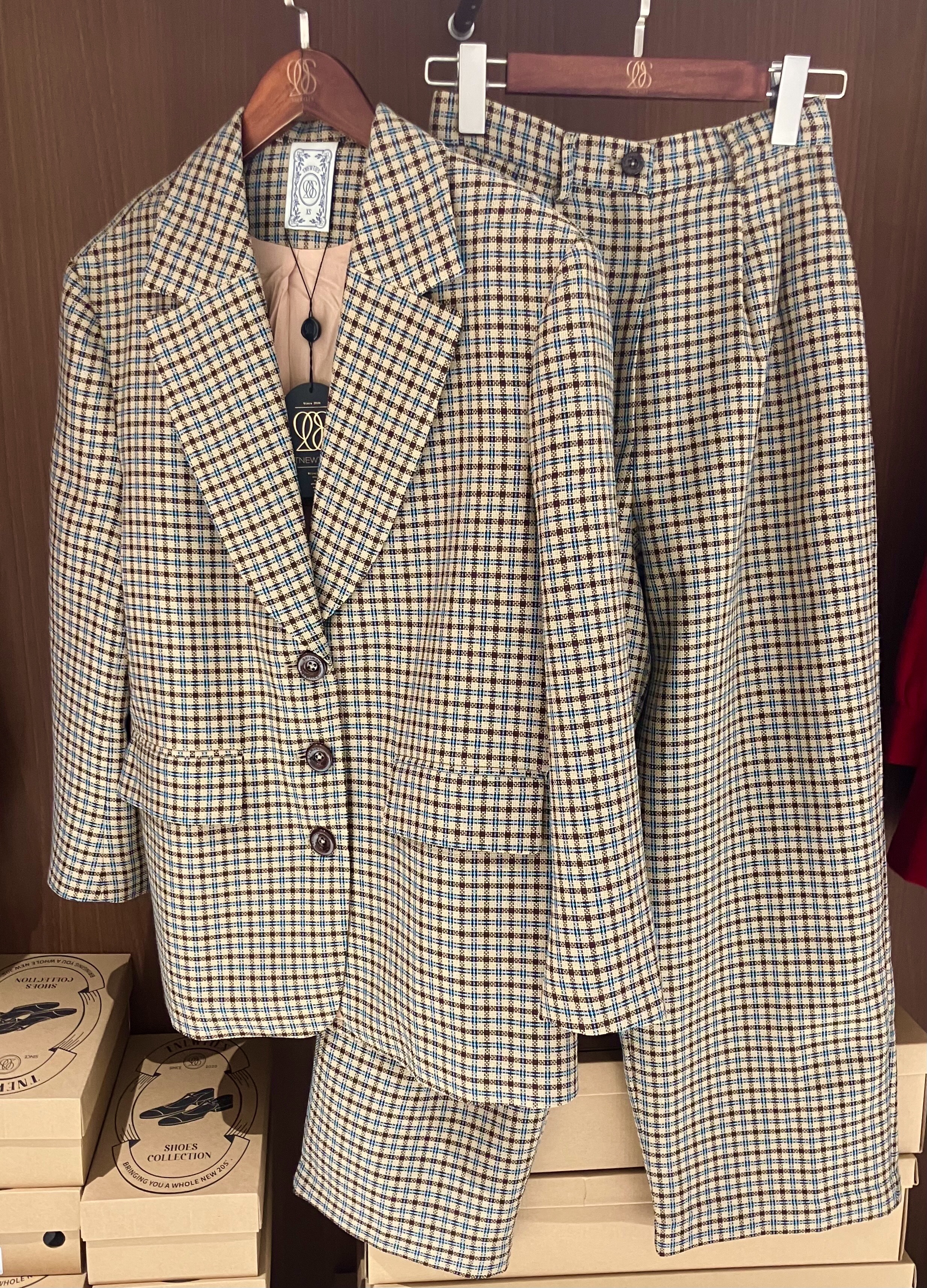 水色を含んだチェック柄がかわいいジャケットとパンツのセットアップです !