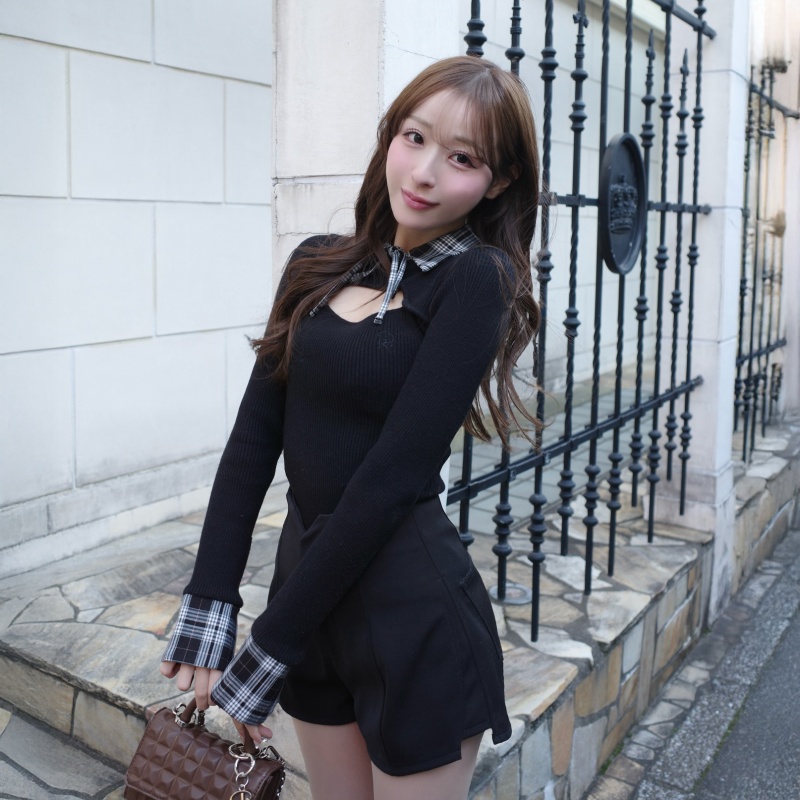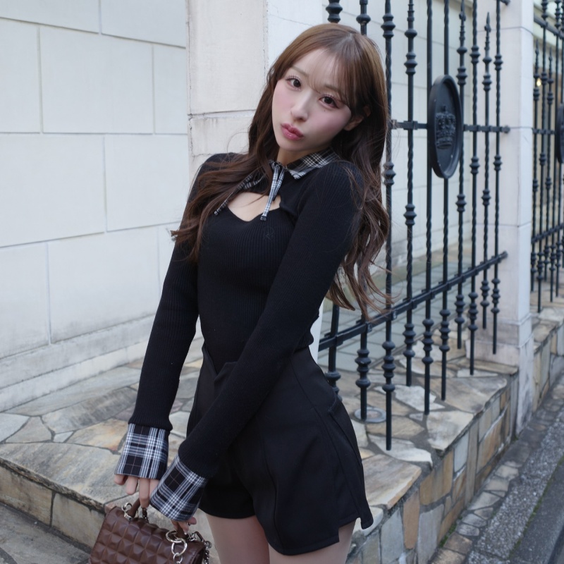襟とカフスのチェックが映えるリブニットで、取り外し可能な襟デザインだからシーンに合わせて雰囲気チェンジも楽しめます♡✨