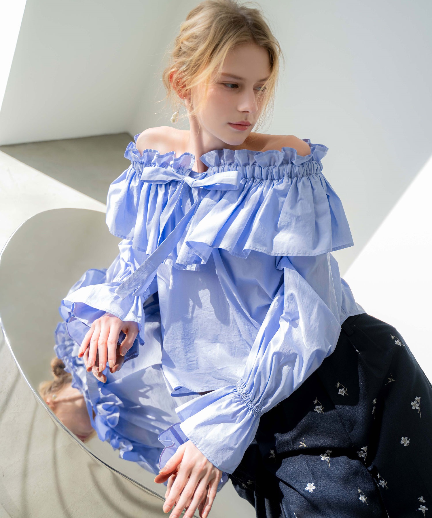 襟元と袖にあしらったフレアが、華やかで印象的なデザインブラウス。