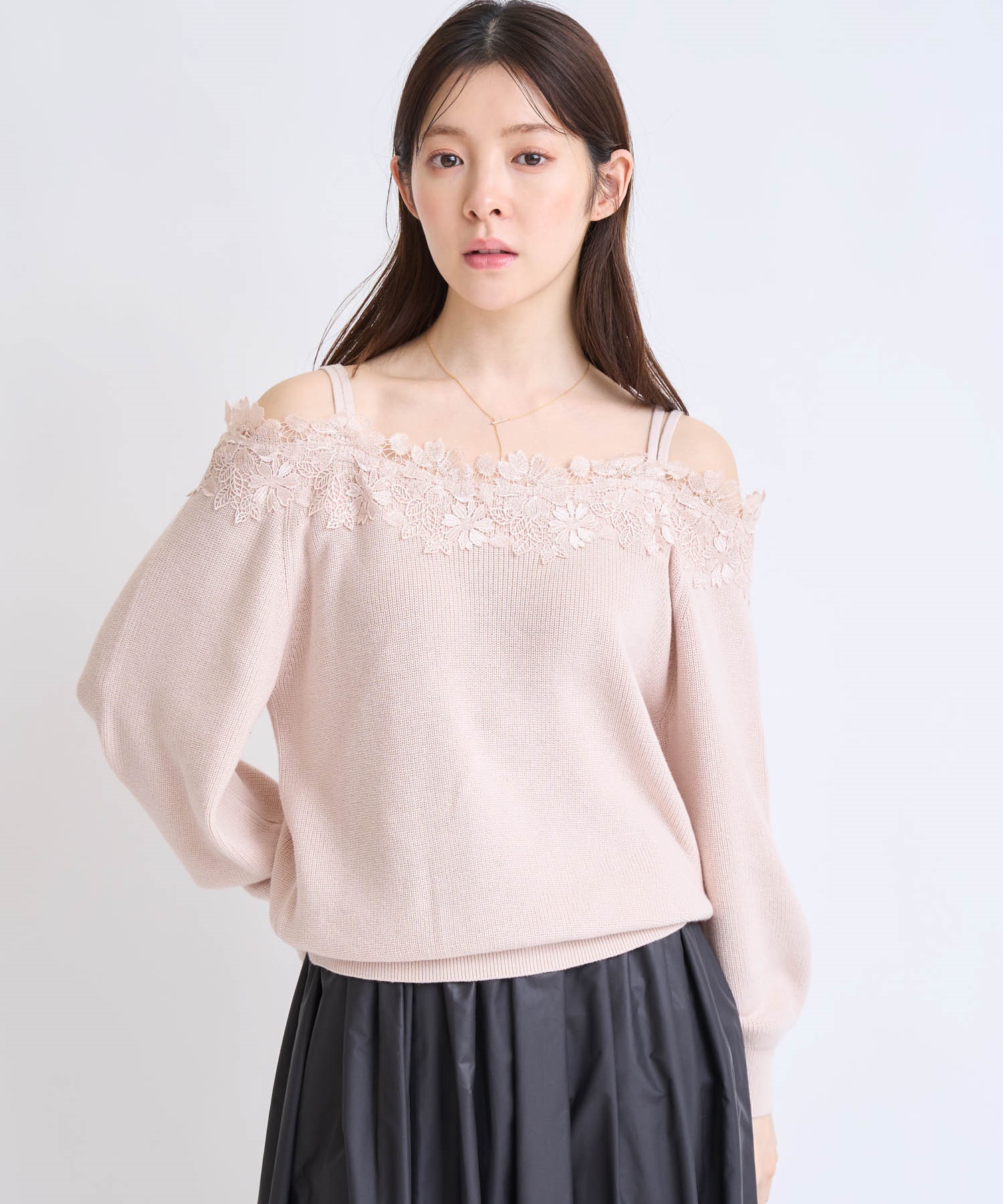 繊細なレースがデコルテを彩る、トレンド感たっぷりのオフショルダーニット。