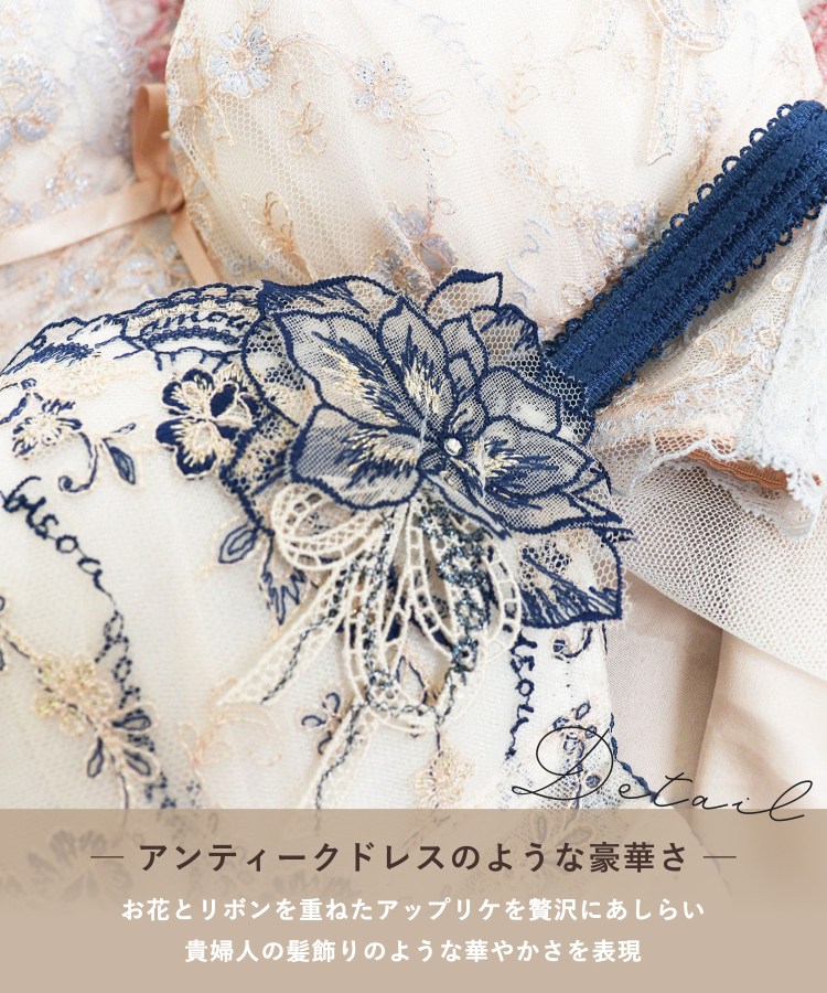 優雅なアンティークの世界から生み出された、愛の言葉が散りばめられたシリーズです。まるでドレスをまとった貴婦人のように、レースのスカラップには繊細なフリル模様をあしらいました。「Un bisou doux sur ta joue」…あなたの頬に優しいキスを「Amour」…愛「Bisou」…キス。ひとつひとつの言葉が、身に着けるだけで映画のワンシーンのようなロマンティックな世界観を演出します。2種類の素材を重ねた大ぶりなお花のアップリケは、立体感を表現。ふんわりと結ばれたリボンをモチーフにしたアップリケと合わせ、3種類のアップリケを贅沢にあしらうことで、まるで優雅な貴婦人の髪飾りのような華やかさを表現しています。