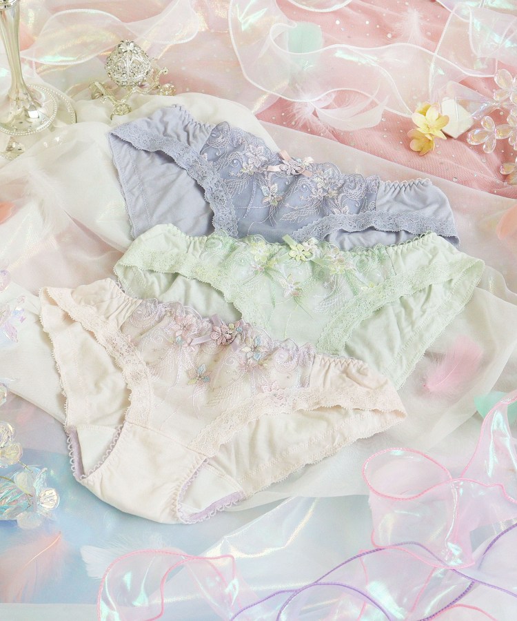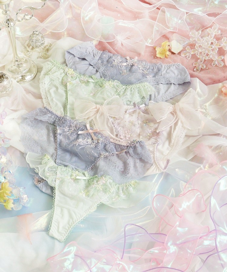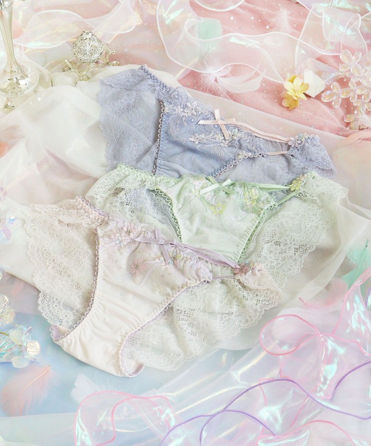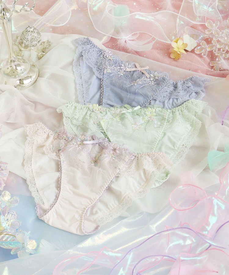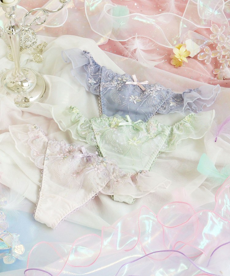 物語に登場する妖精「ティンカーベル」をモチーフにしたシリーズです。レースにはくるくると曲線を描く羽や、小花の刺繍を様々なステッチで散りばめて、ティンカーベルが軽やかに舞う様子を表現。色とりどりのオーロラ糸やマルチ糸を織り交ぜることで、妖精の光の粒子が放つ、夢のような輝きを演出します。サイドとバックスタイルにはお揃いのアップリケをあしらい、細部まで華やかな印象に。光の角度によって表情を変える繊細なきらめきが、身に着けるだけでときめきの魔法をかける、ロマンティックなコレクションです。