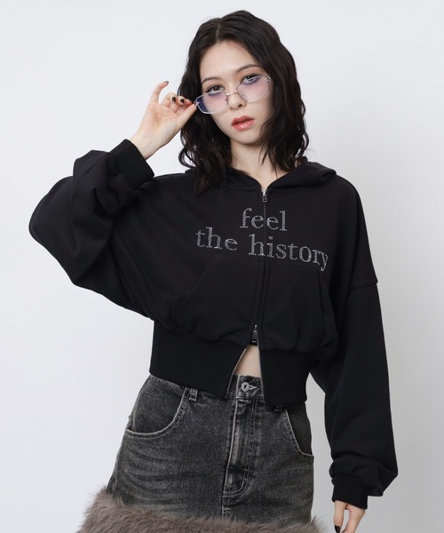 ラインストーンのロゴがきらっと輝く、ショート丈のフード付きパーカー。