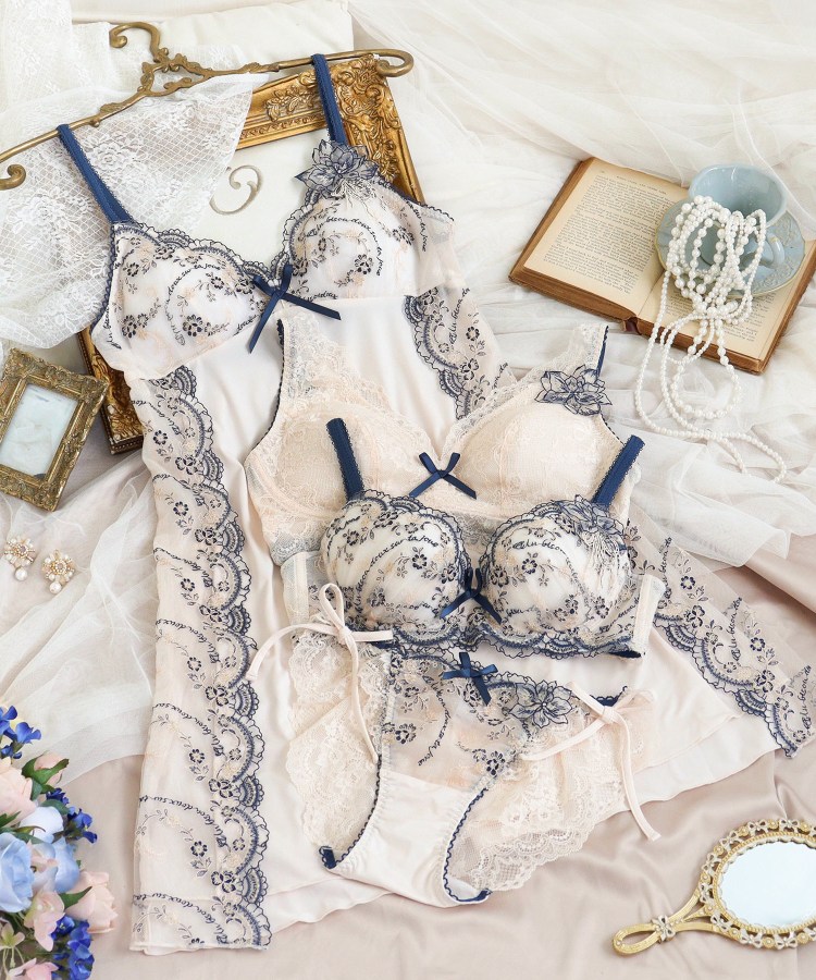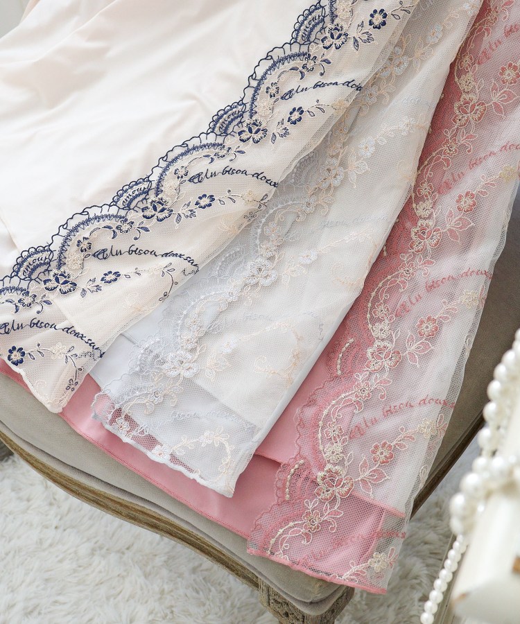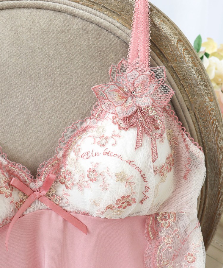 優雅なアンティークの世界から生み出された、愛の言葉が散りばめられたシリーズです。まるでドレスをまとった貴婦人のように、レースのスカラップには繊細なフリル模様をあしらいました。「Un bisou doux sur ta joue」…あなたの頬に優しいキスを「Amour」…愛「Bisou」…キス。ひとつひとつの言葉が、身に着けるだけで映画のワンシーンのようなロマンティックな世界観を演出します。2種類の素材を重ねた大ぶりなお花のアップリケは、立体感を表現。ふんわりと結ばれたリボンをモチーフにしたアップリケと合わせ、3種類のアップリケを贅沢にあしらうことで、まるで優雅な貴婦人の髪飾りのような華やかさを表現しています。サイド部分は繊細なレースを活かすためあえて縫い付けず、動くたびにひらひらと揺れる女性らしい印象に。バックスタイルは肌がのぞくカッティングデザインで、ストレッチレースとお揃いのアップリケをあしらいました。