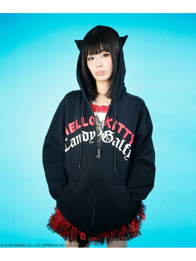 大胆なバックプリントとフードのリボンモチーフが目を惹く、存在感抜群の一枚。
