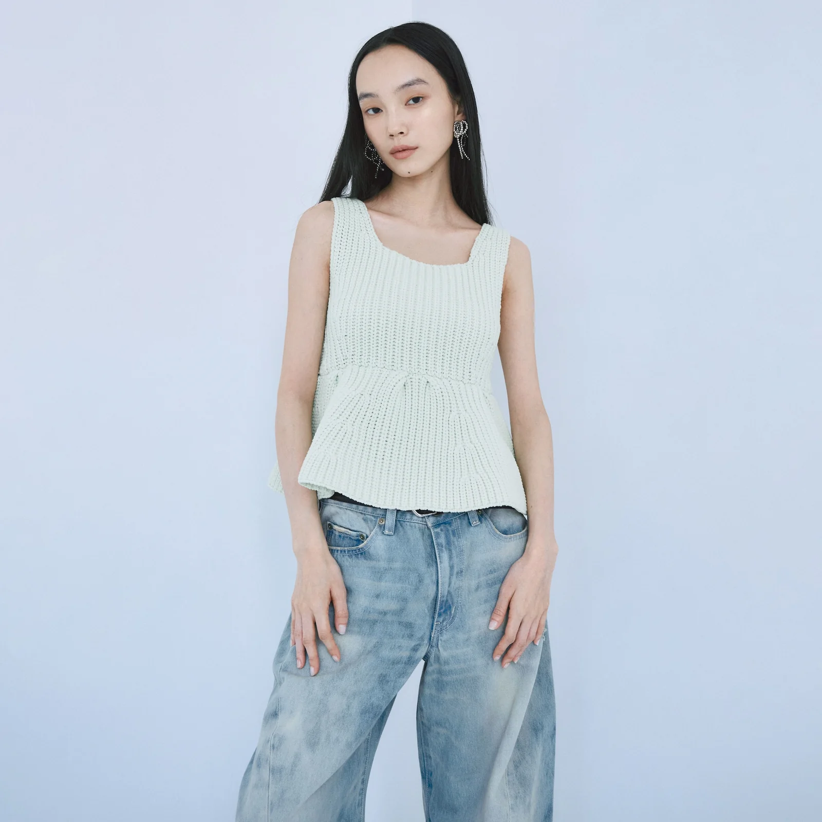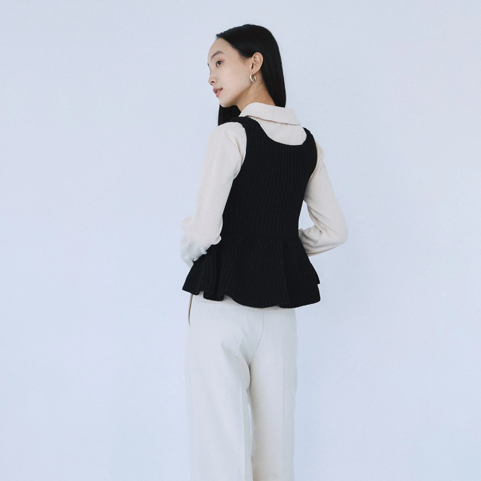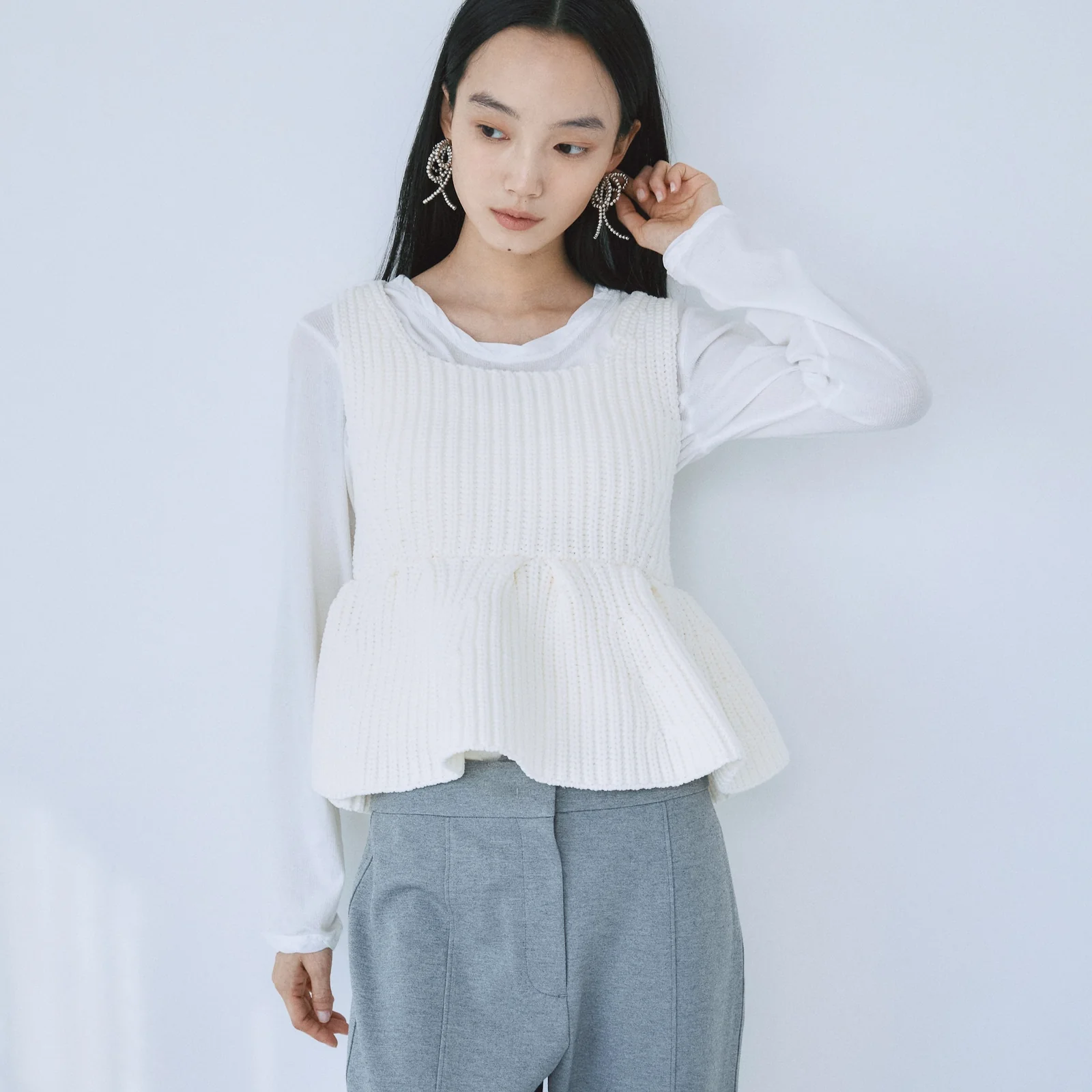 空気感のあるハイストレッチニットで仕立てたペプラムトップス。