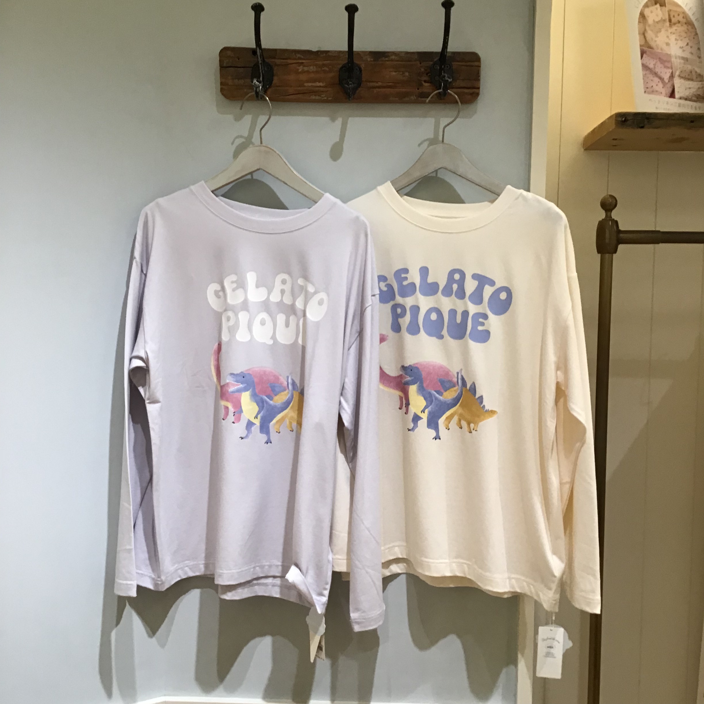 ブルーのティラノサウルス、ピンクのブラキオサウルス、イエローのステゴサウルスが集合したPOPなロゴ入りのロングTシャツ💙💖💛