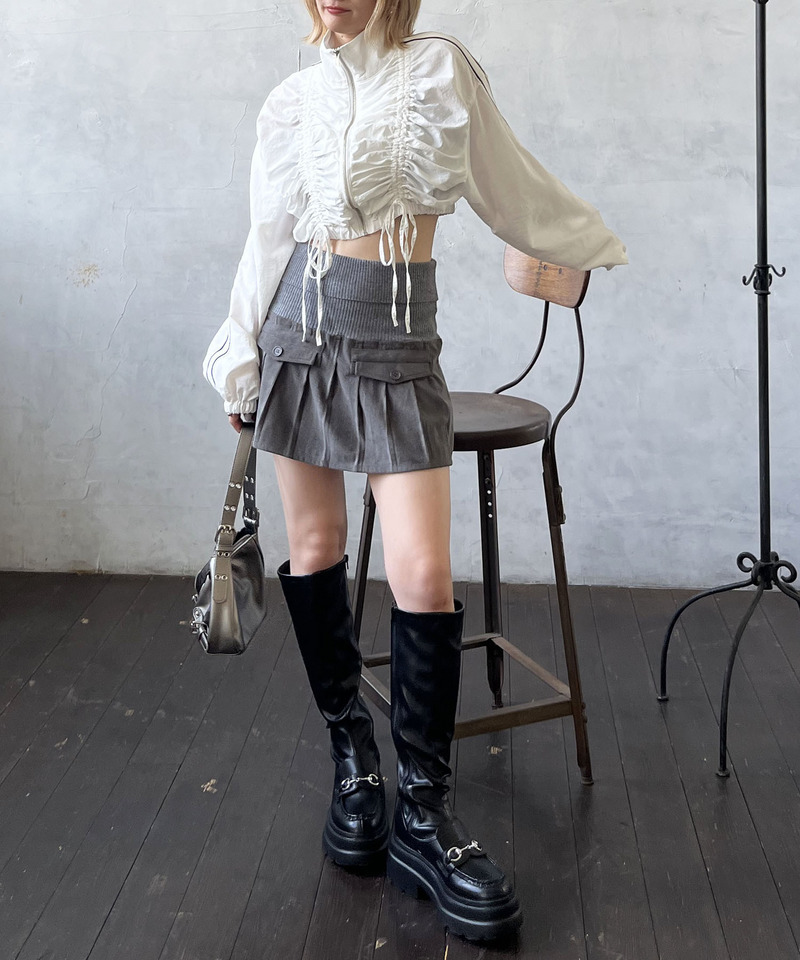 袖のラインテープがスポーティなアクセントを加え、フロントの2本ギャザーが立体感と女性らしさを演出します。
