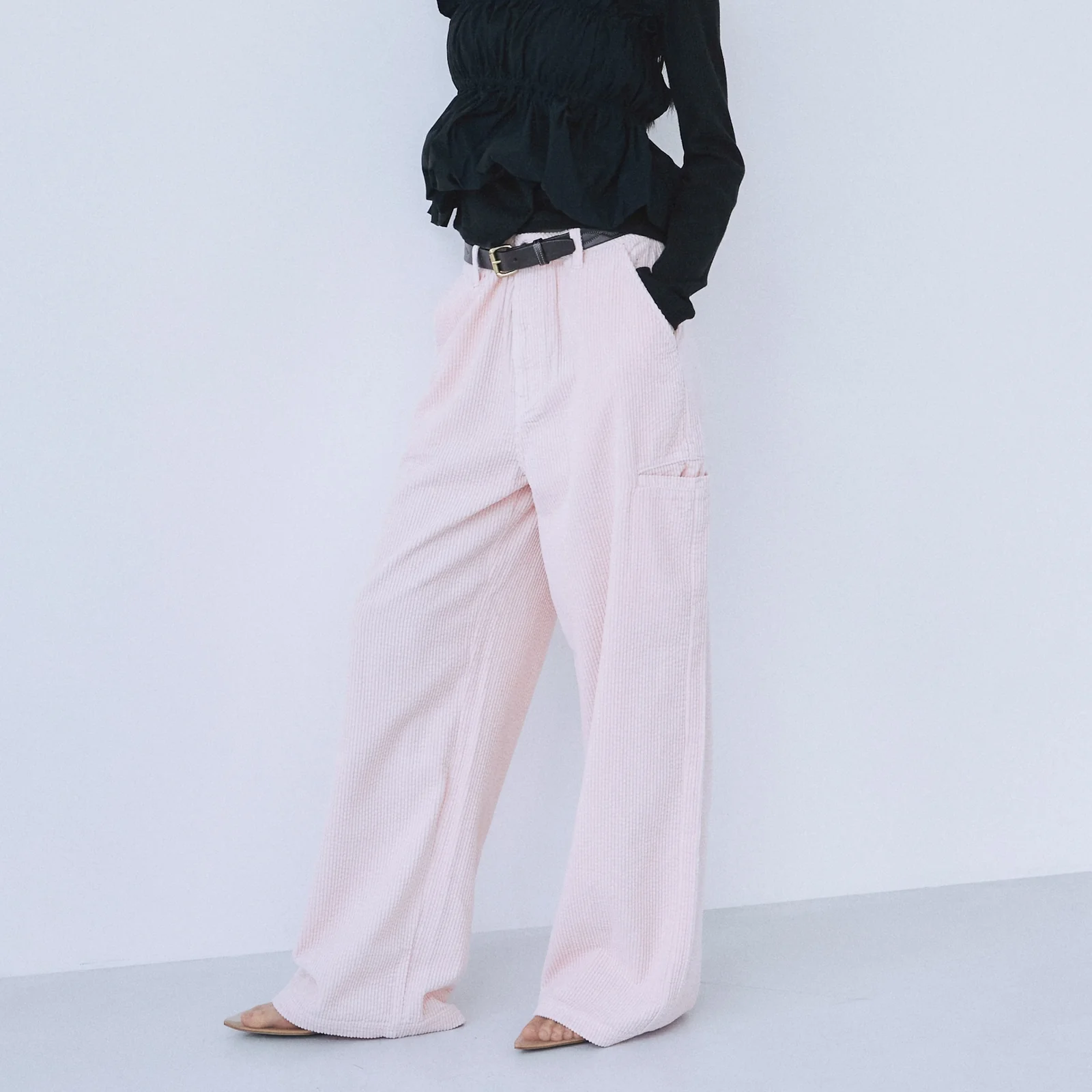 カーブベルト仕様によりウエストにフィットし、腰まわりはコンパクトに見せつつ全体はゆとりを持たせたワイドシルエット。